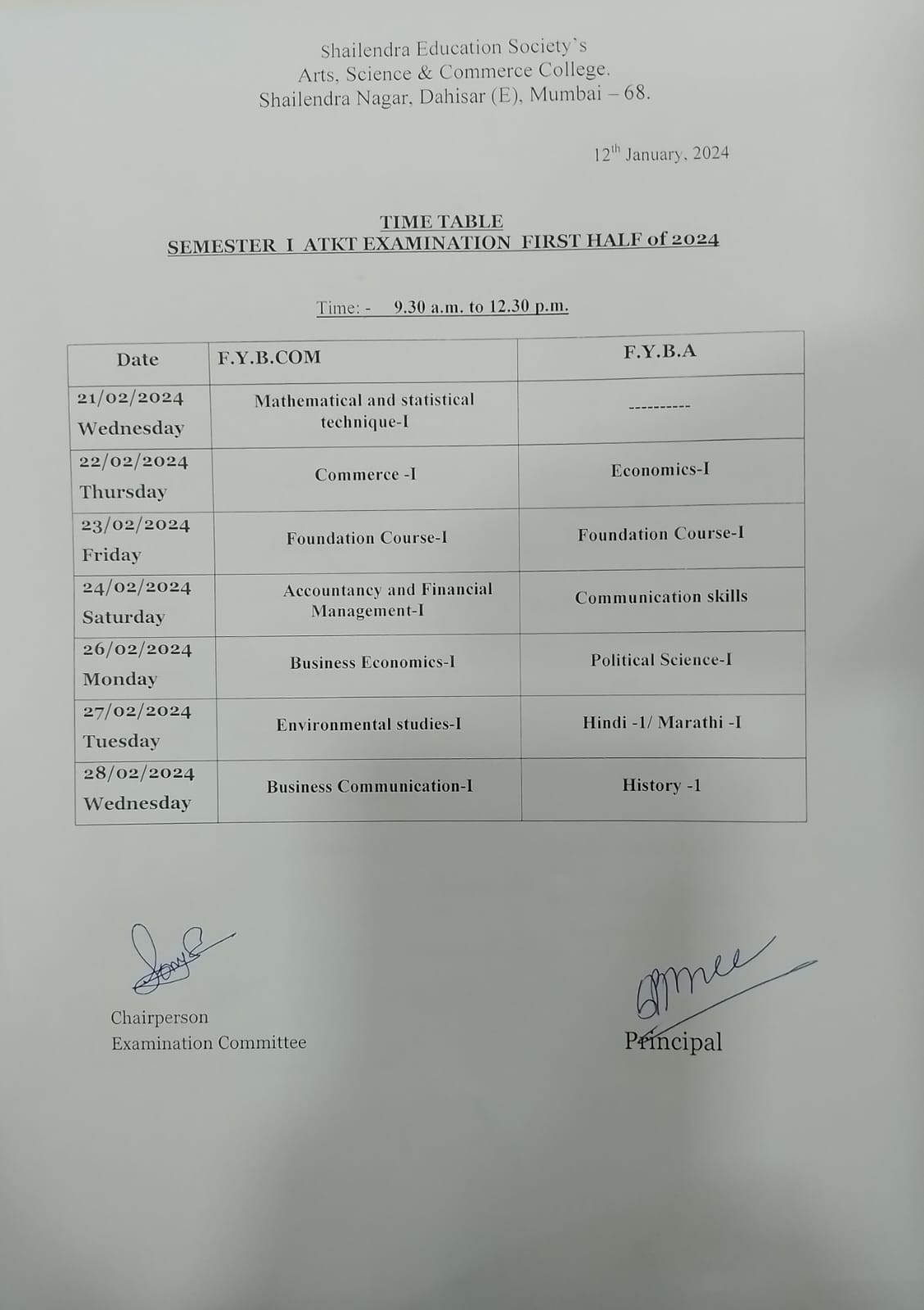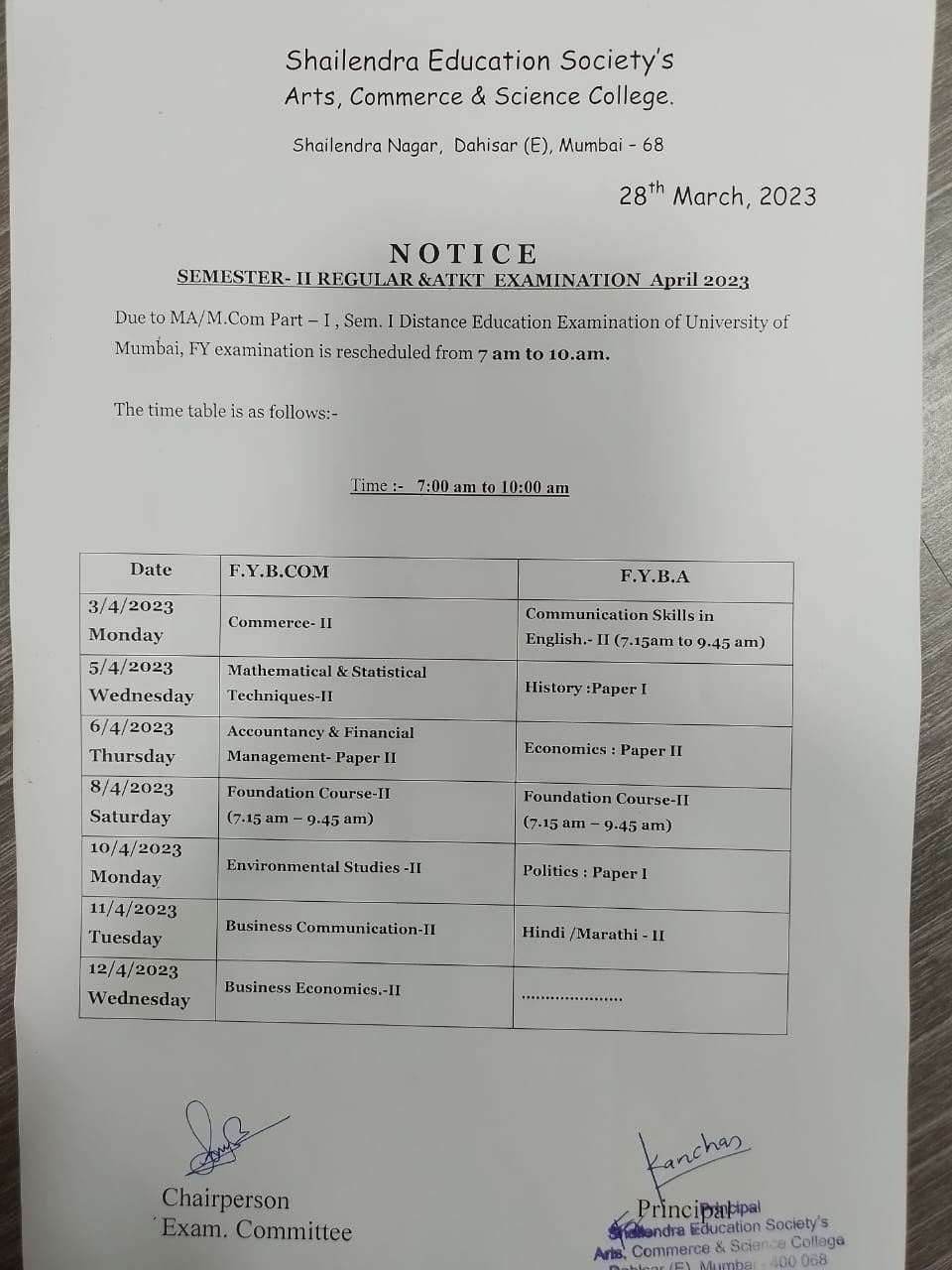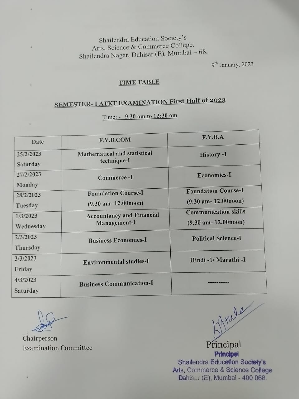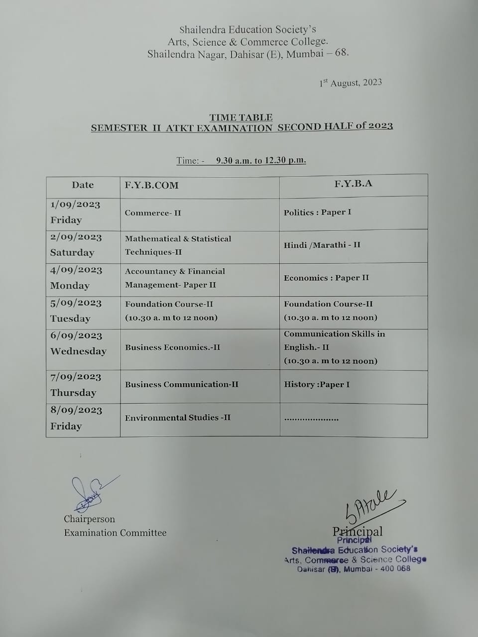 FY B.Com, BA SEM II ATKT Second Half 2023 Examination Time Table