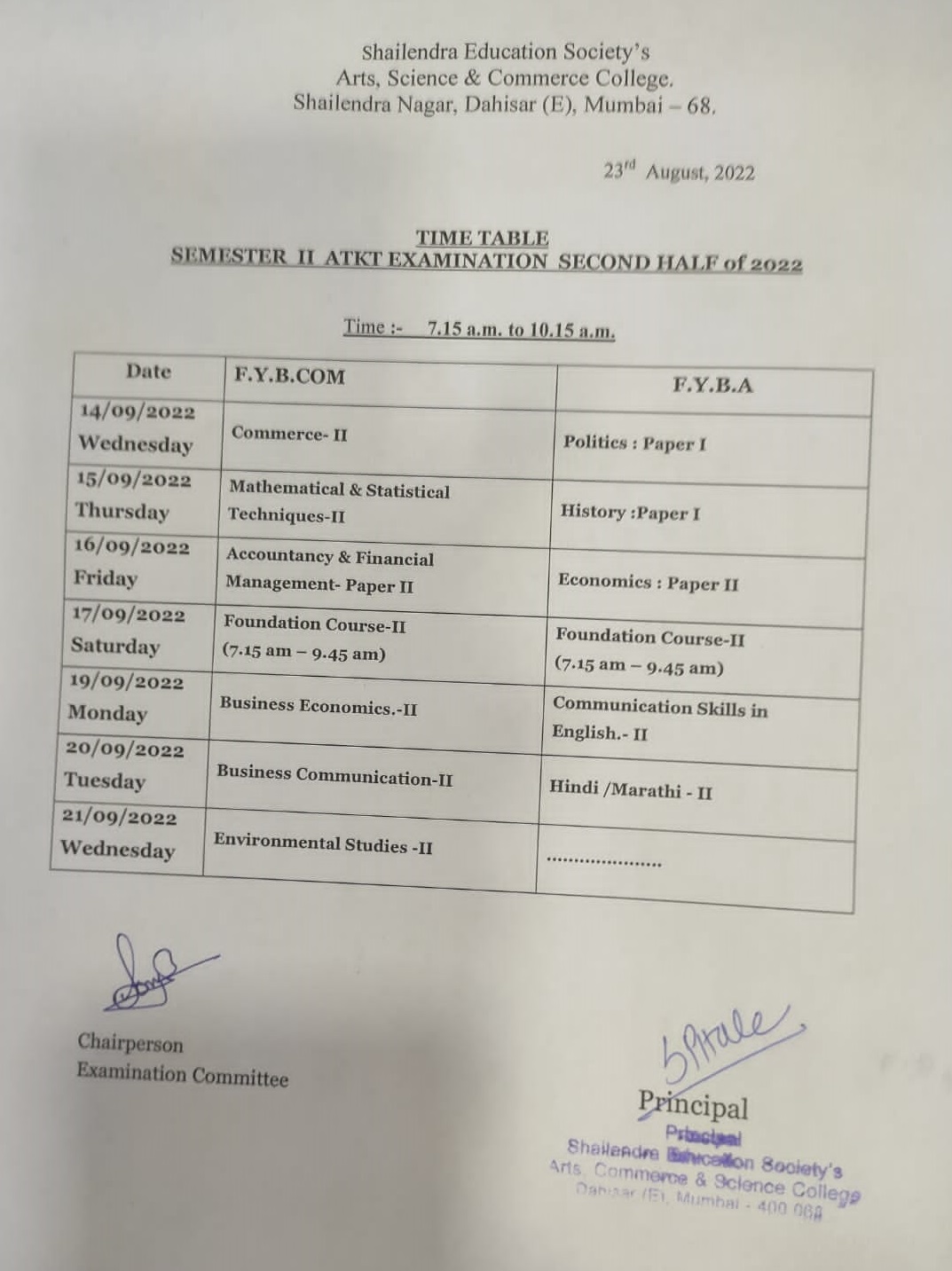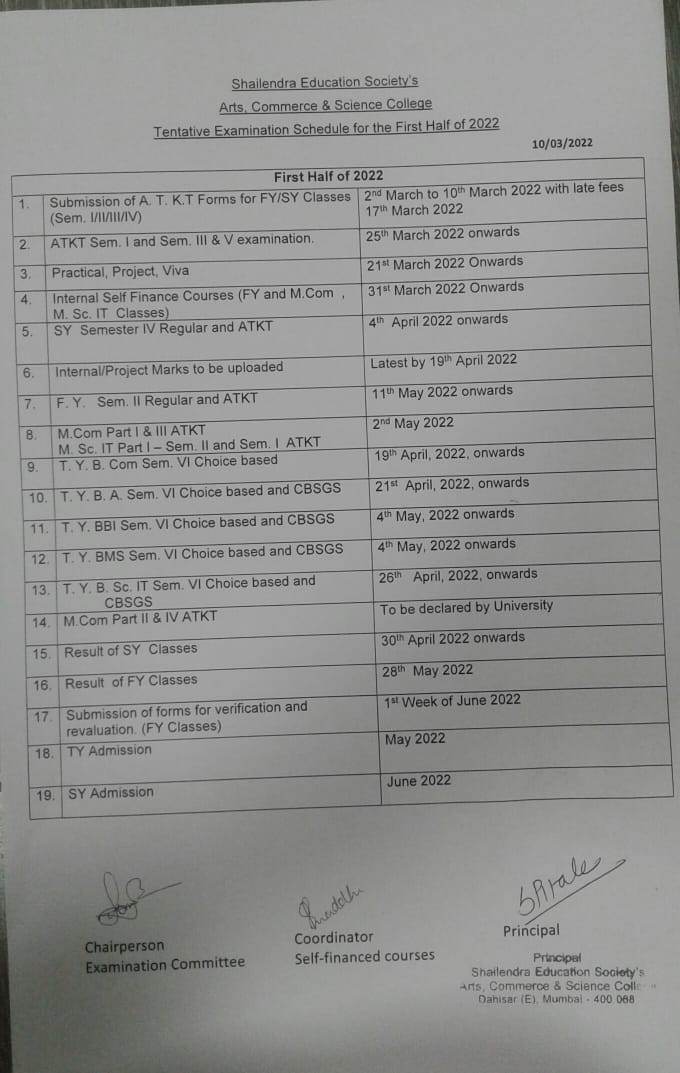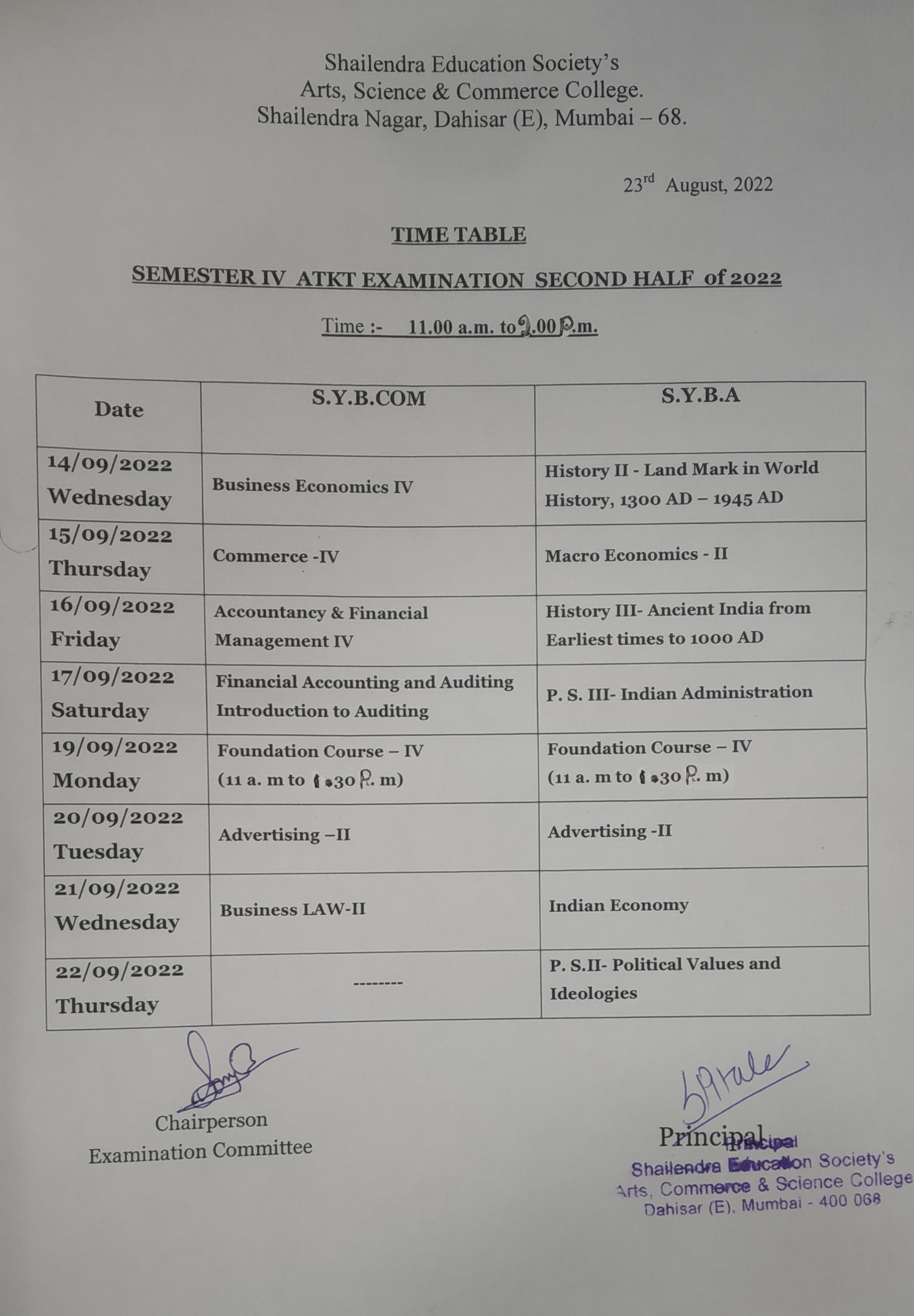 Time table of Additional Examination SYBA and SYBCOM