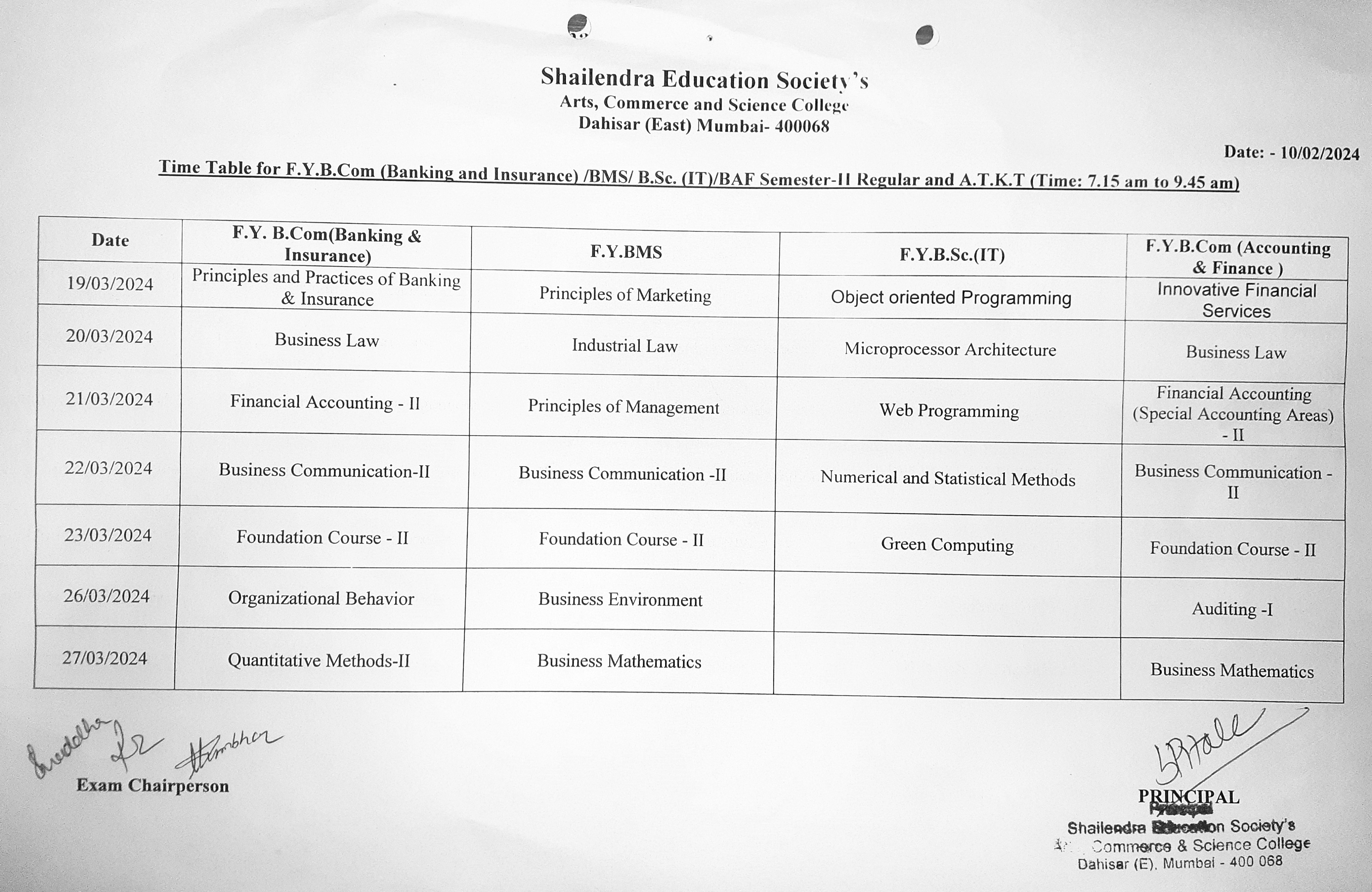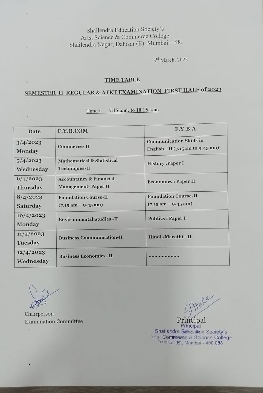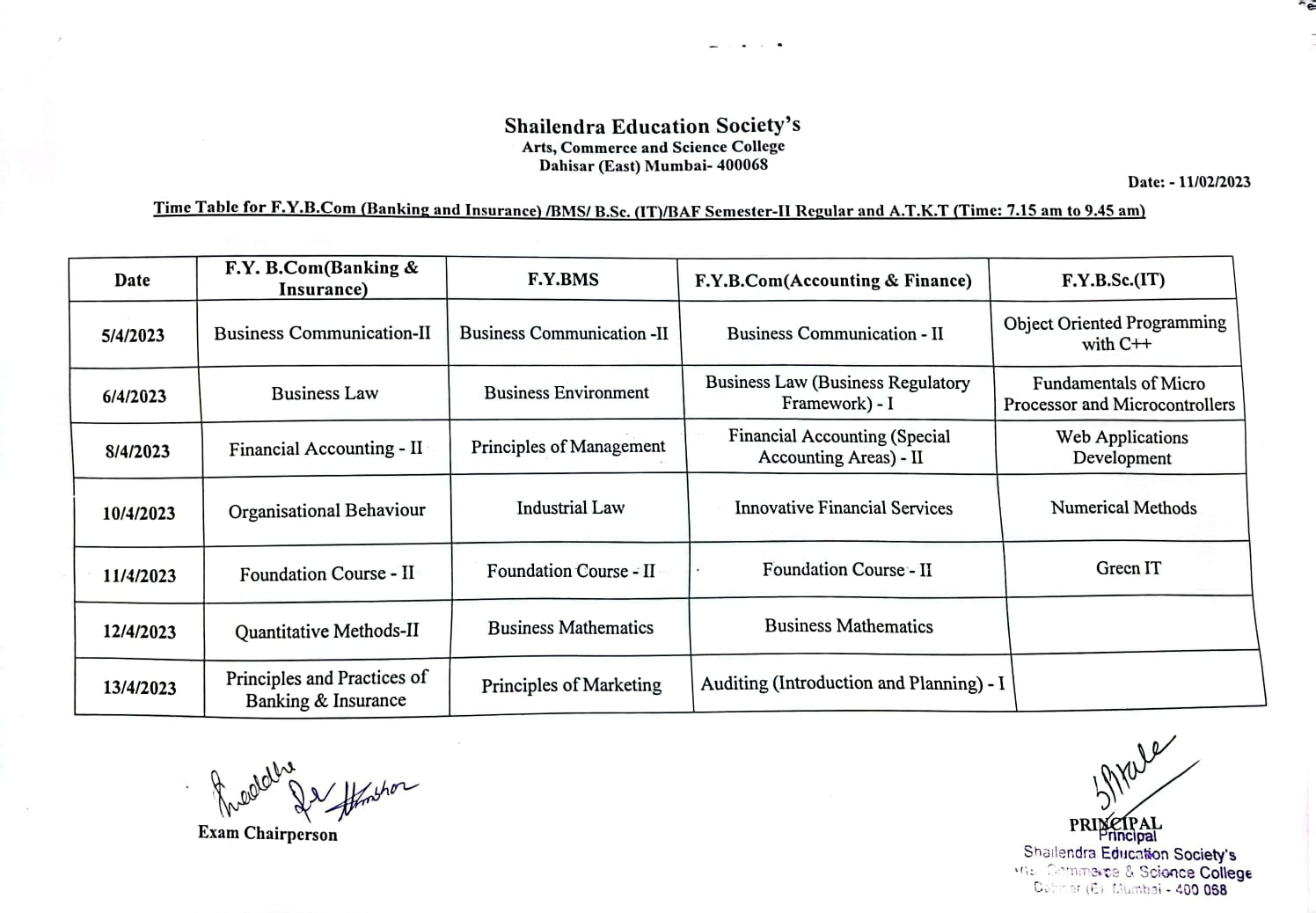 F.Y.B.Com/B.A. SEM-II Regular and ATKT Time Table- Updated