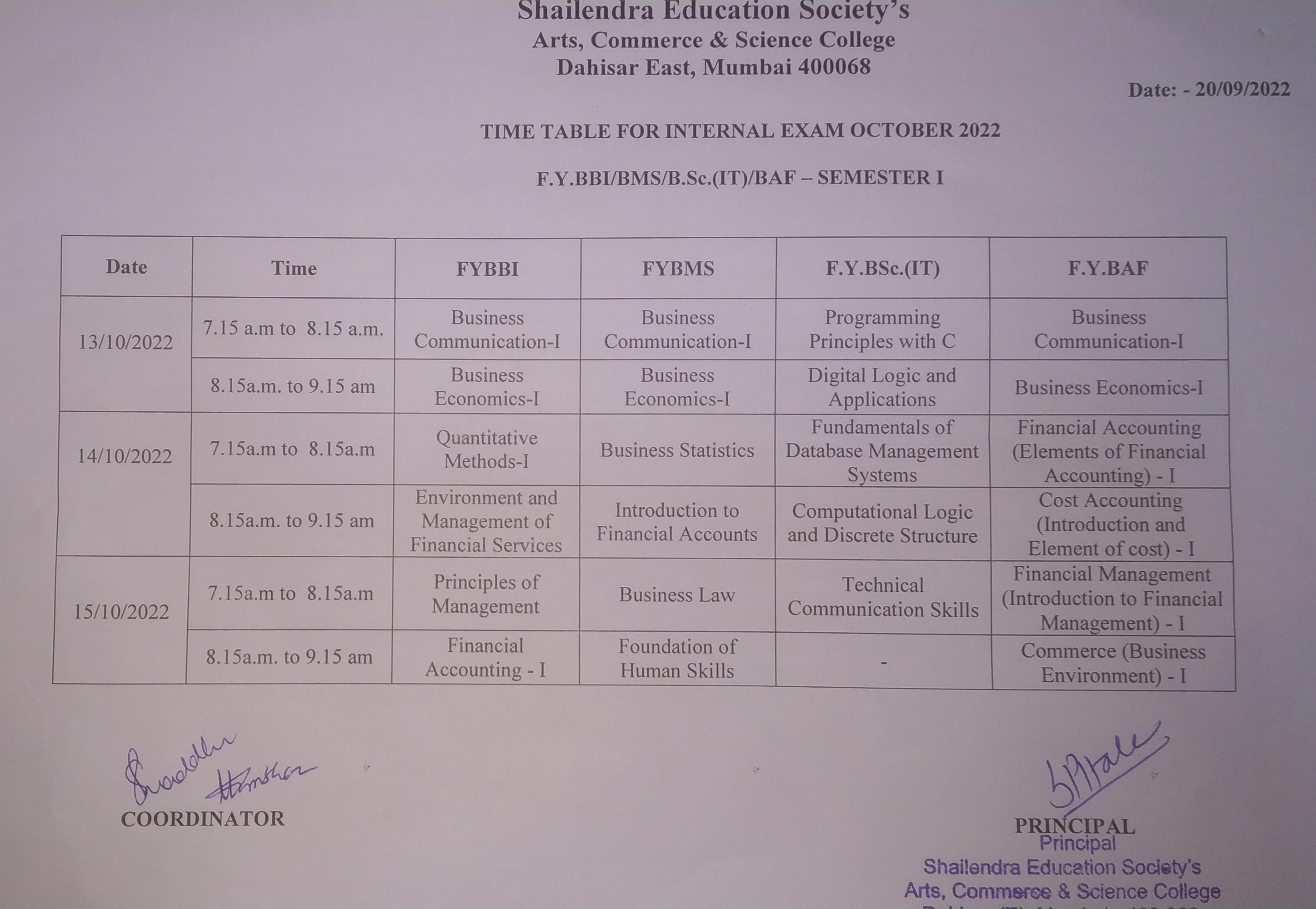 F.Y.BBI/BMS/B.Sc.(IT)/BAF SEM-I Internal Exam. Oct 2022