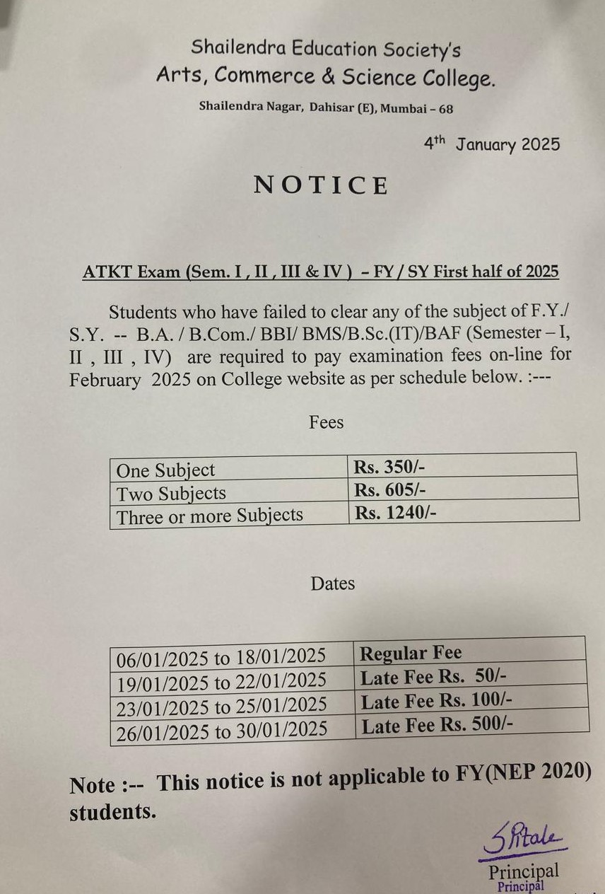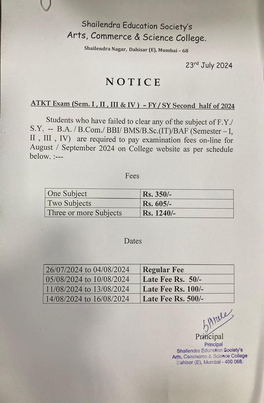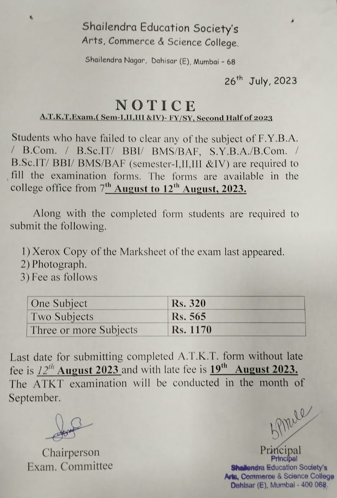 FY/SY SEM-I/II/III/IV ATKT Form Notice