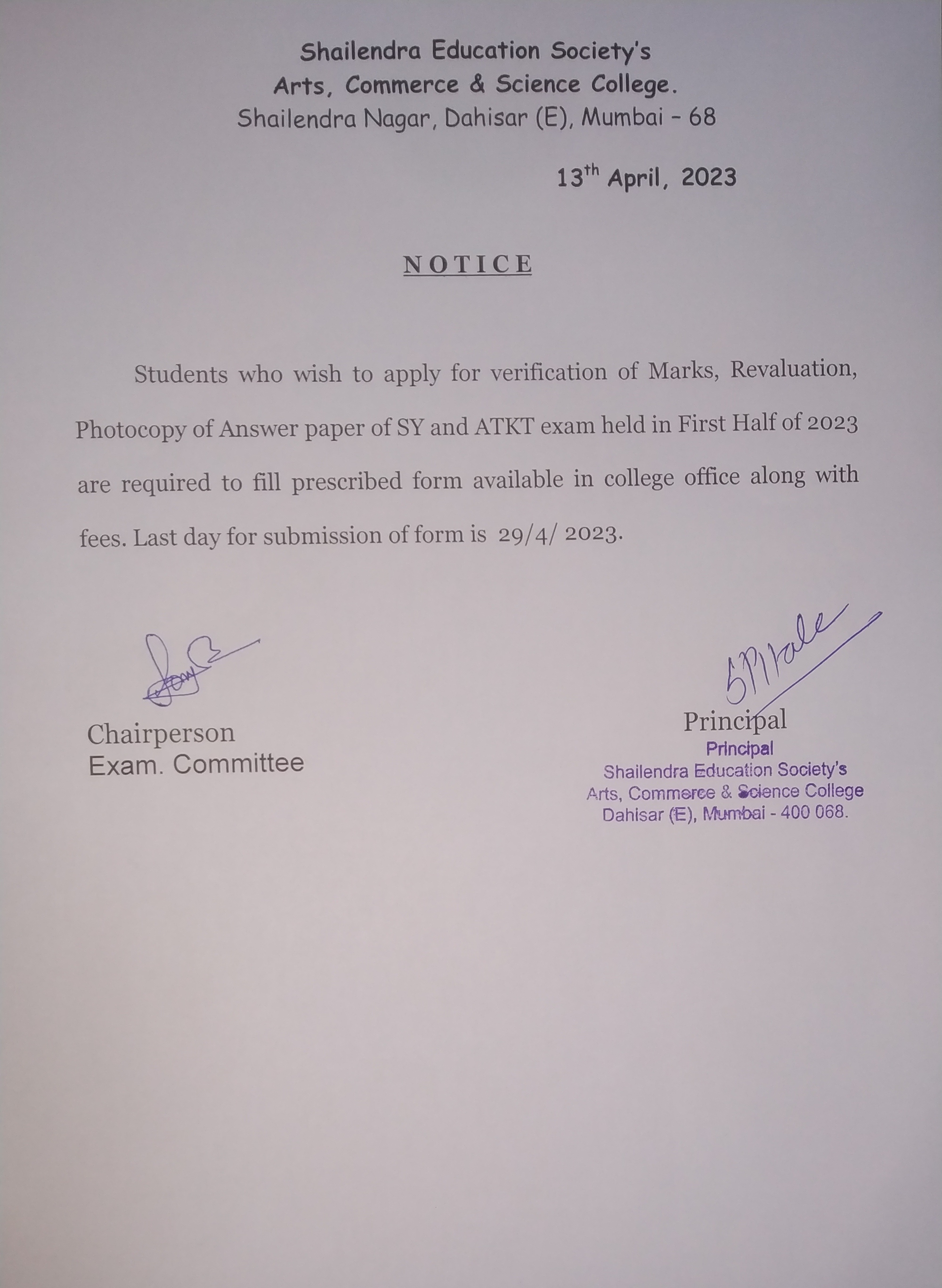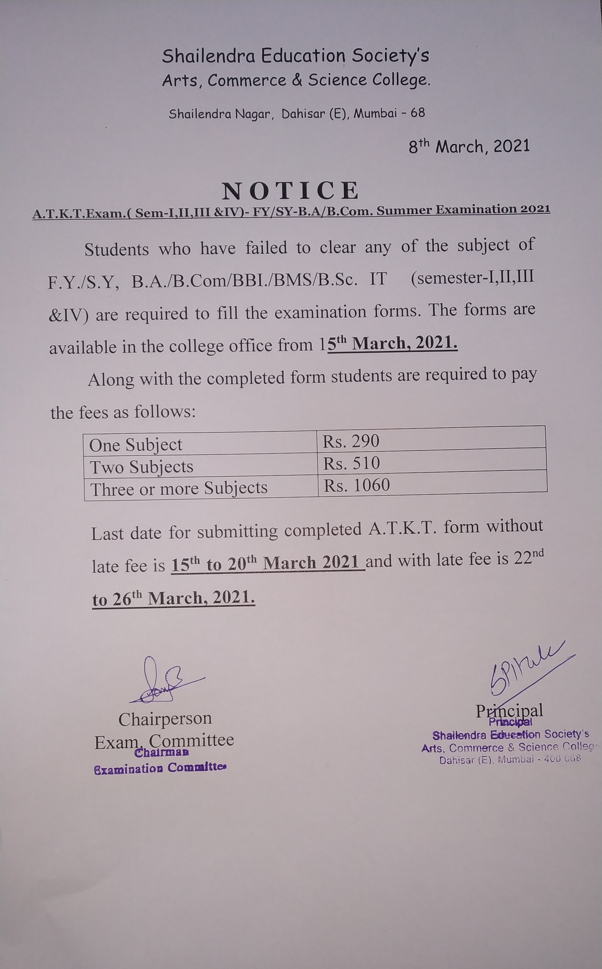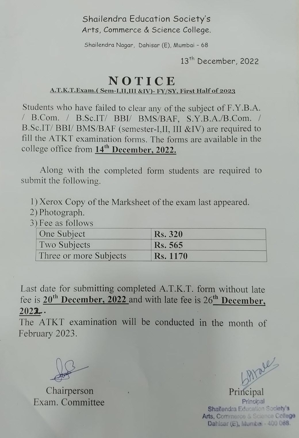 FY/SY SEM-I/II/III/IV ATKT Form Notice