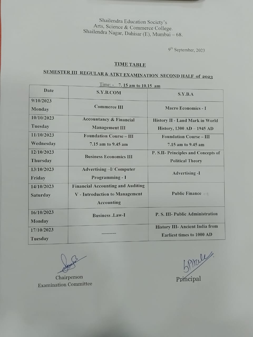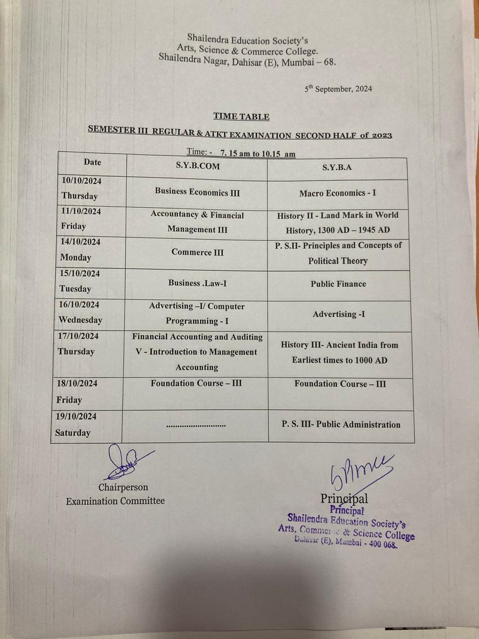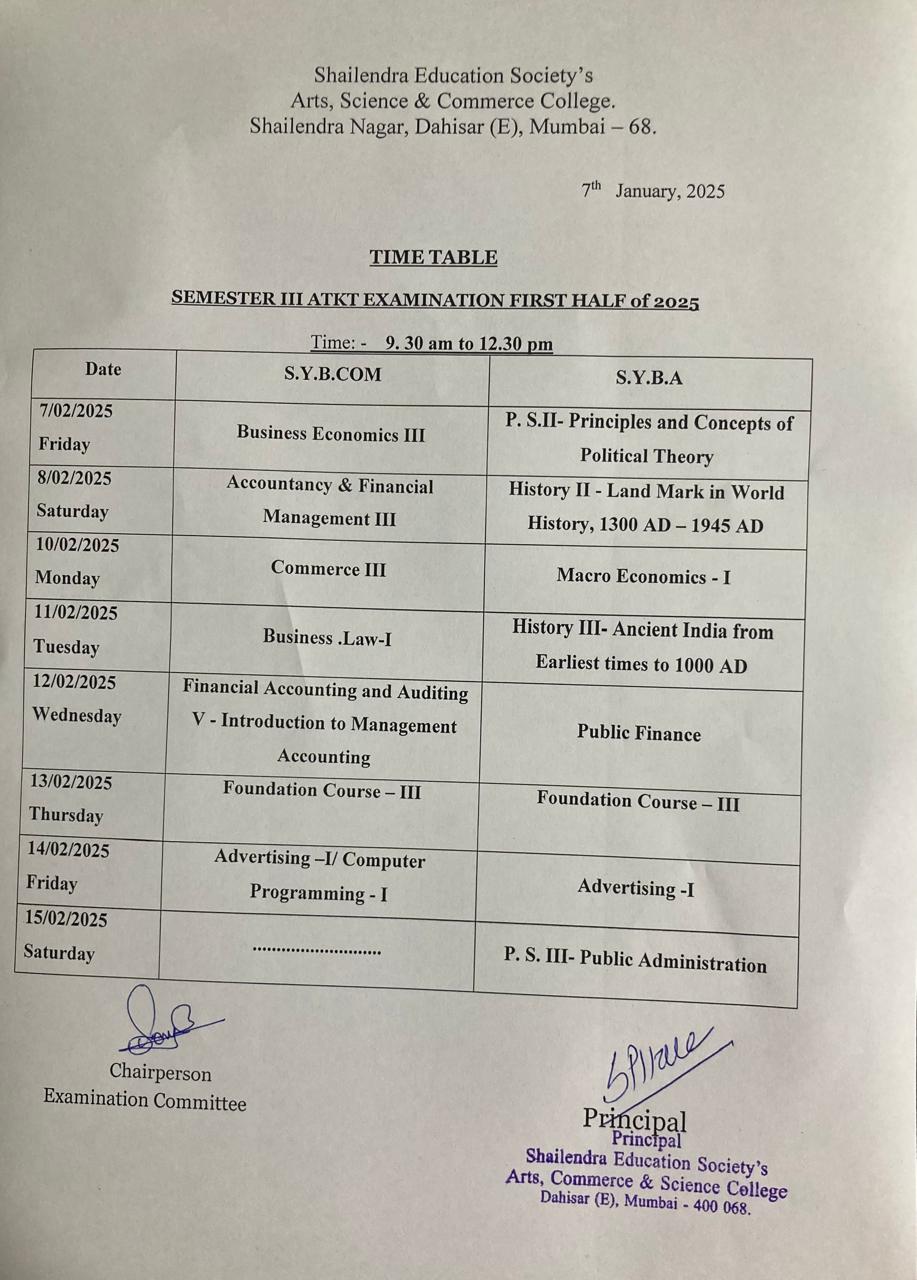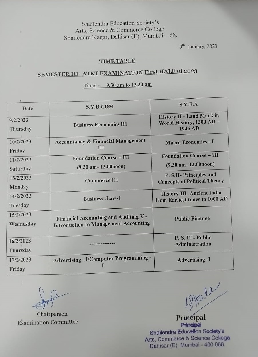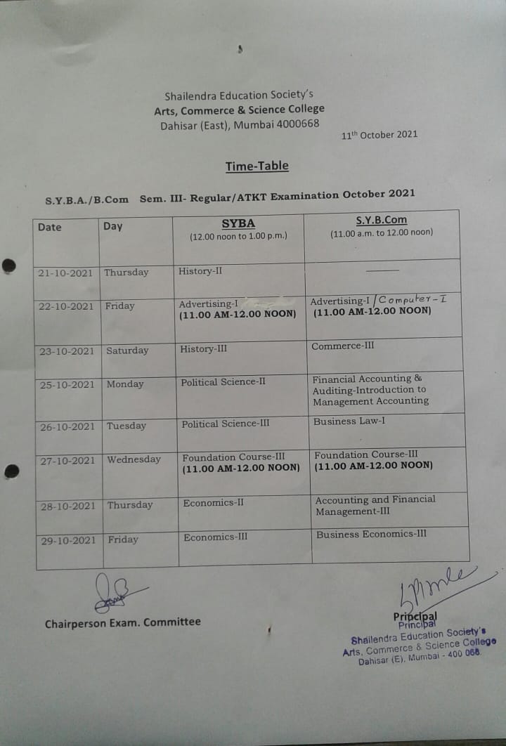 SYB.Com/B.A SEM III Regular and ATKT Exam time table