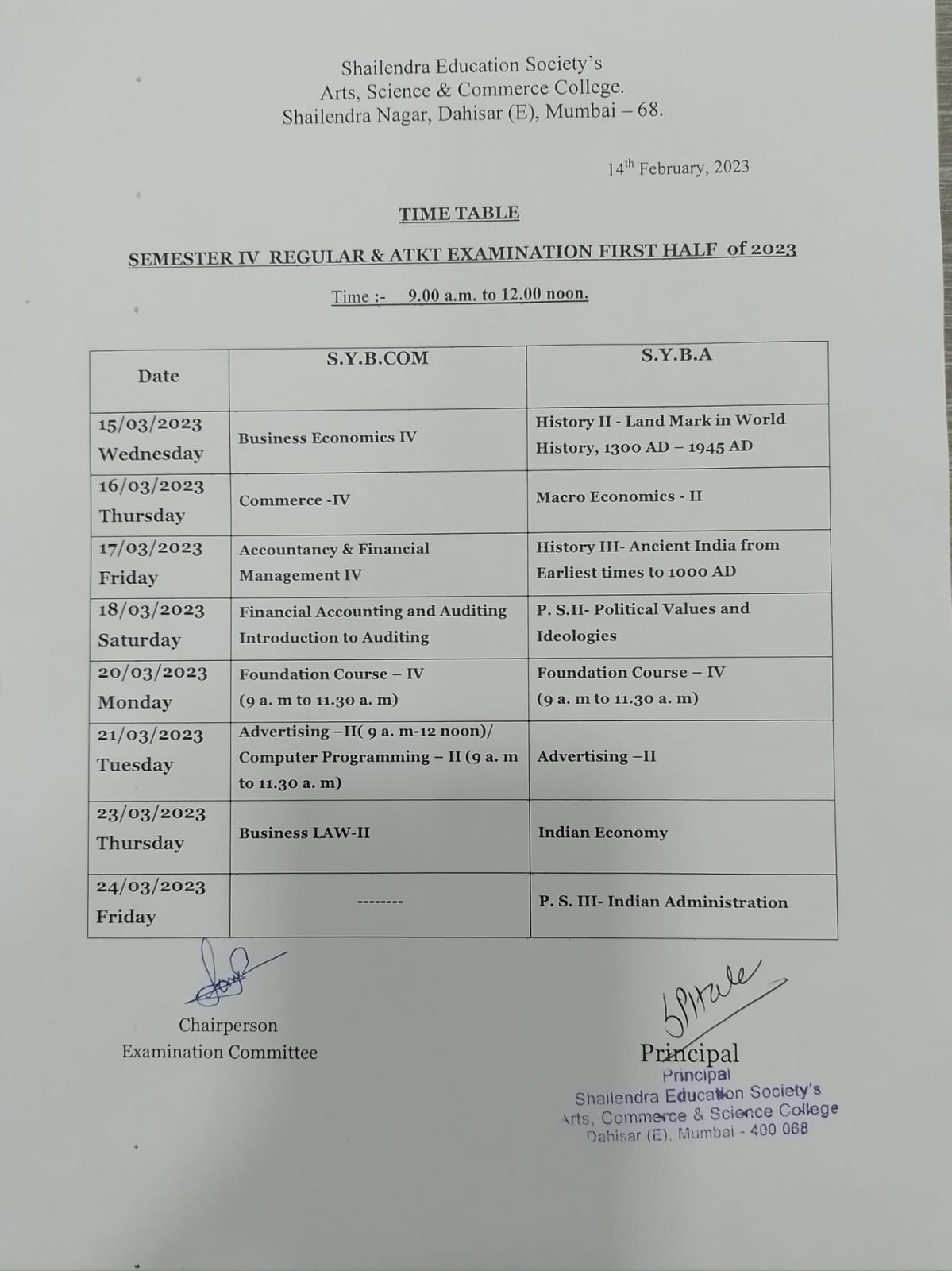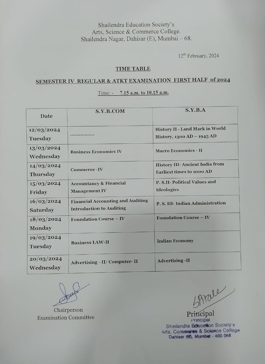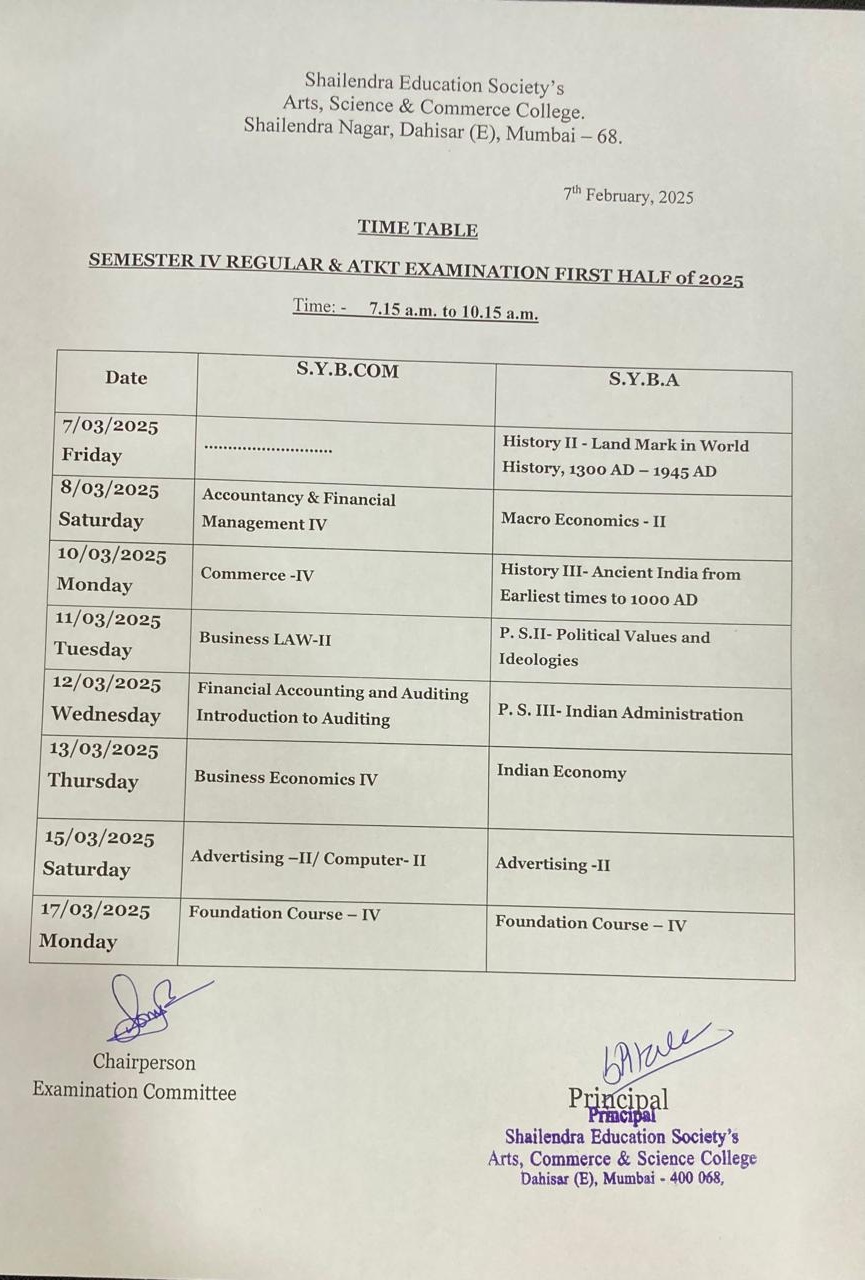 S.Y.B.Com/B.A. SEM-IV Regular and ATKT Time Table