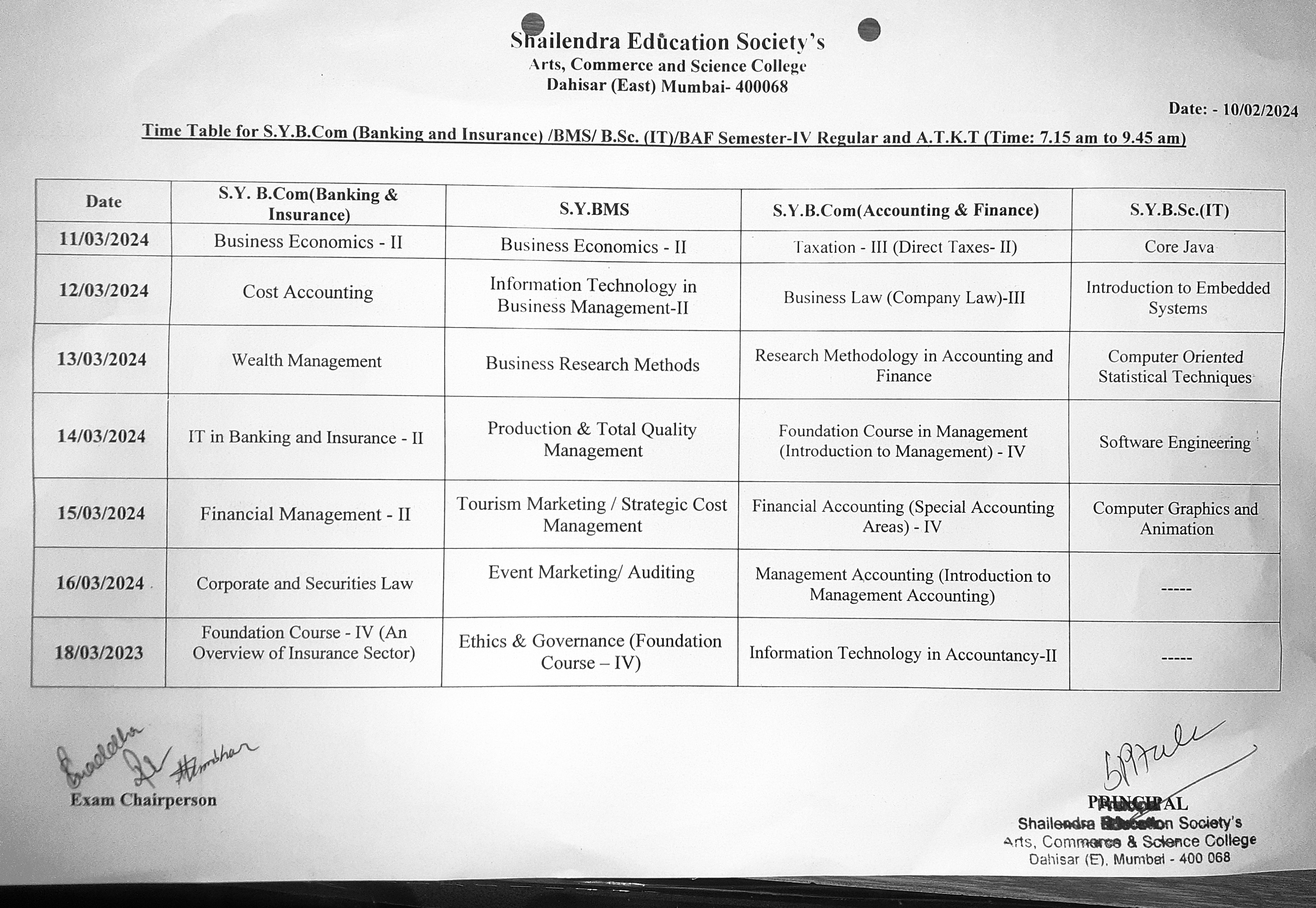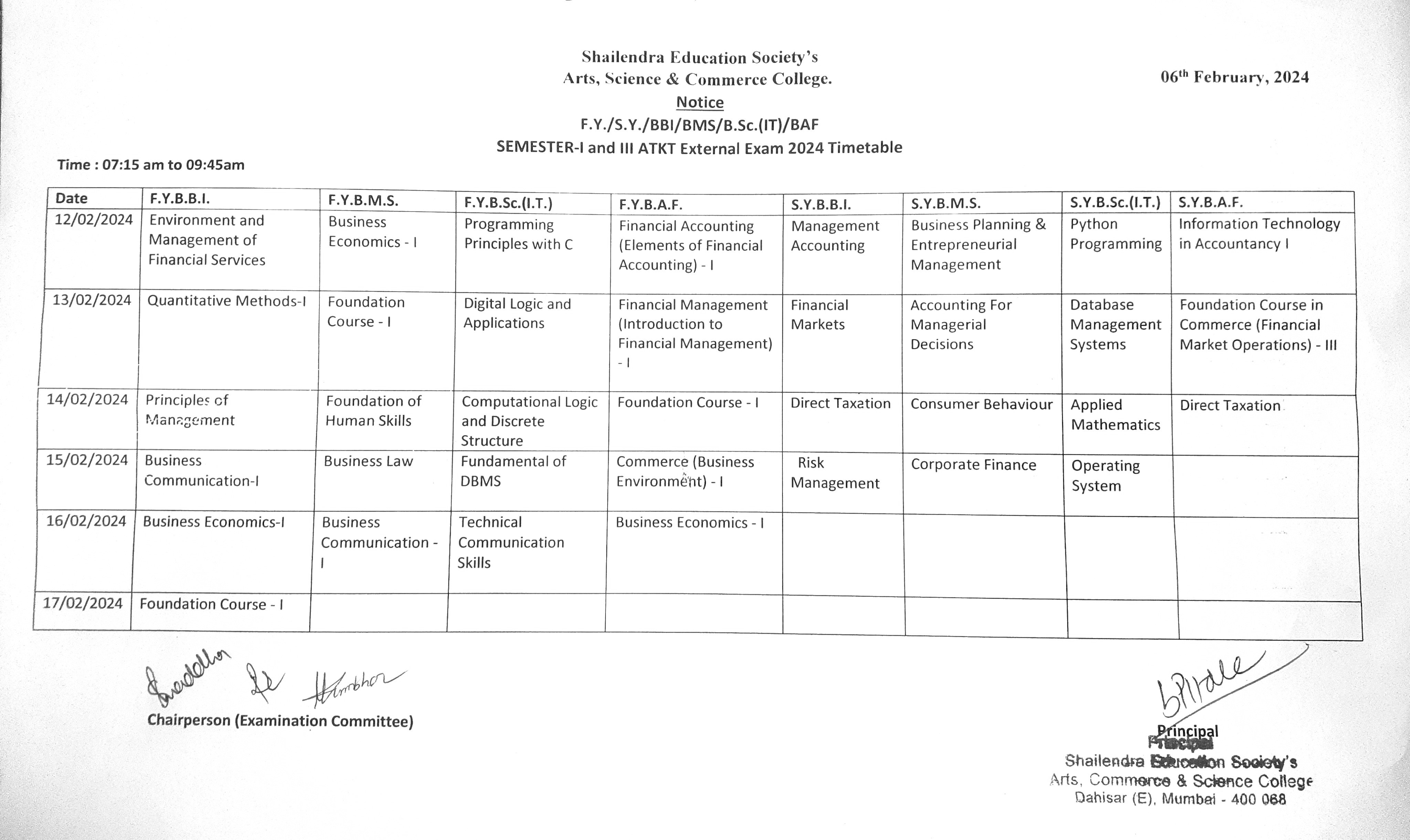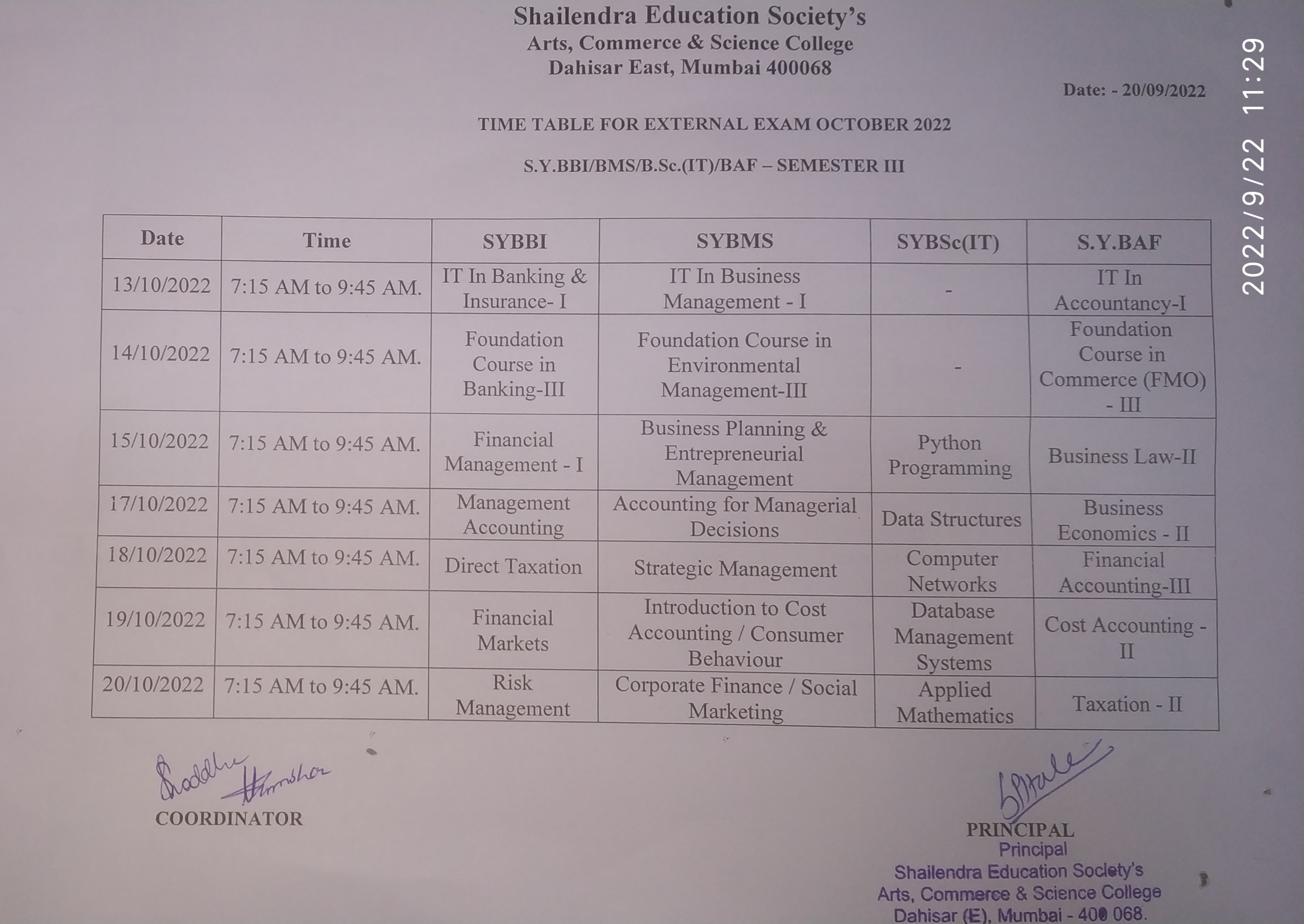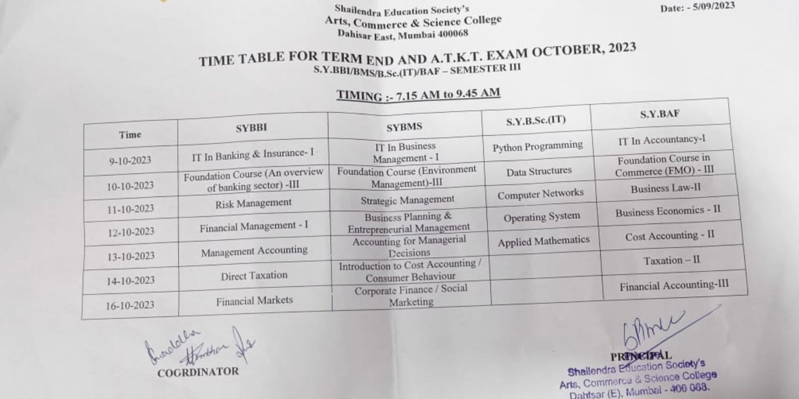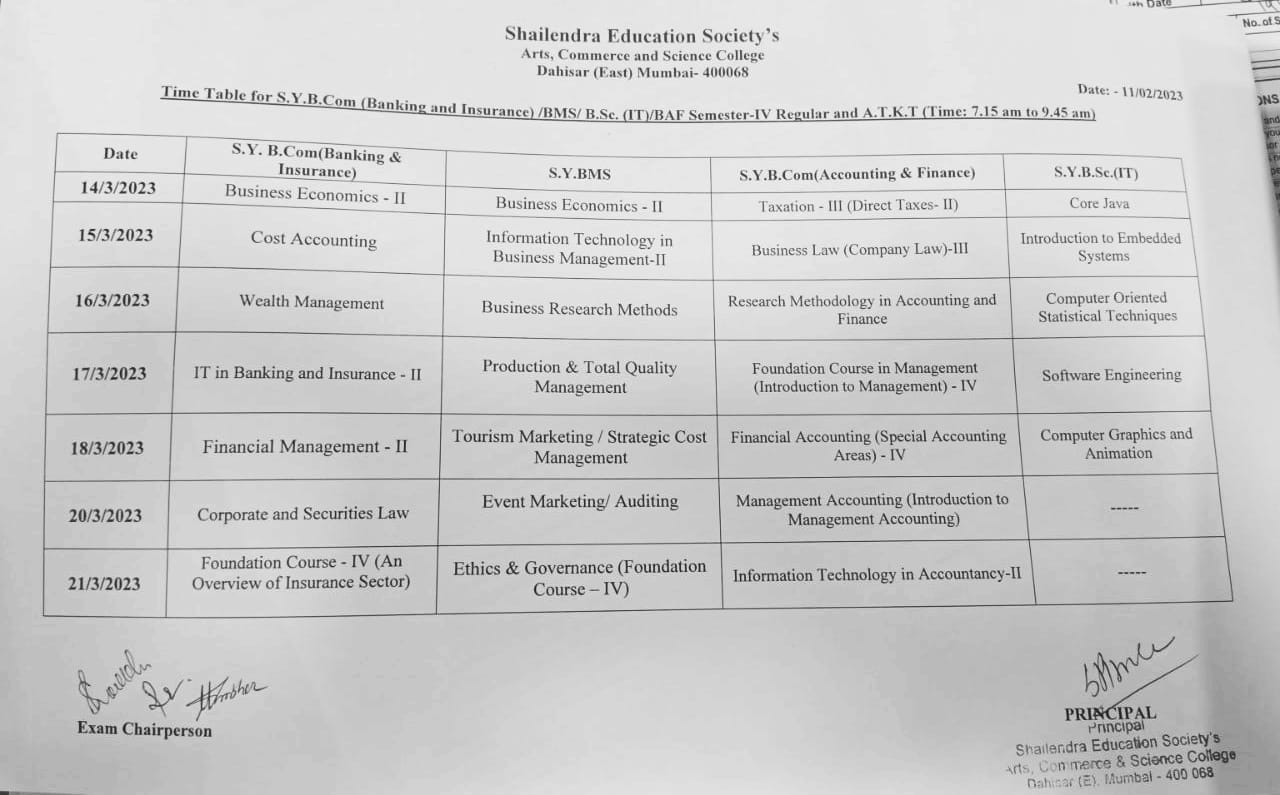 S.Y./BBI/BMS/BSc.IT SEM III AND ATKT Exam Timetable