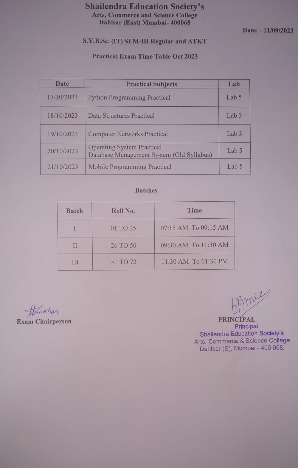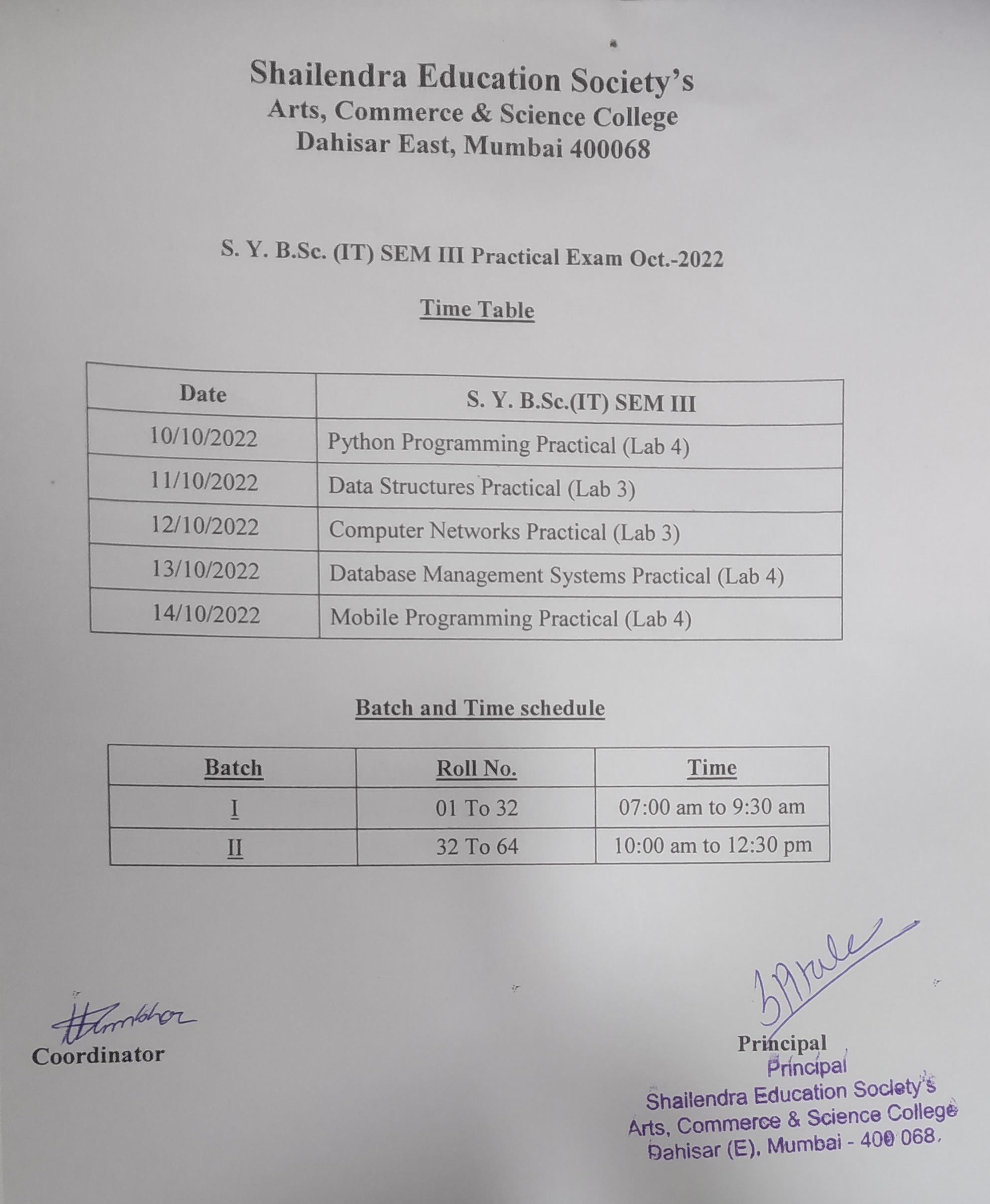 S.Y.BSc.IT SEM III AND ATKT Practical Exam Timetable