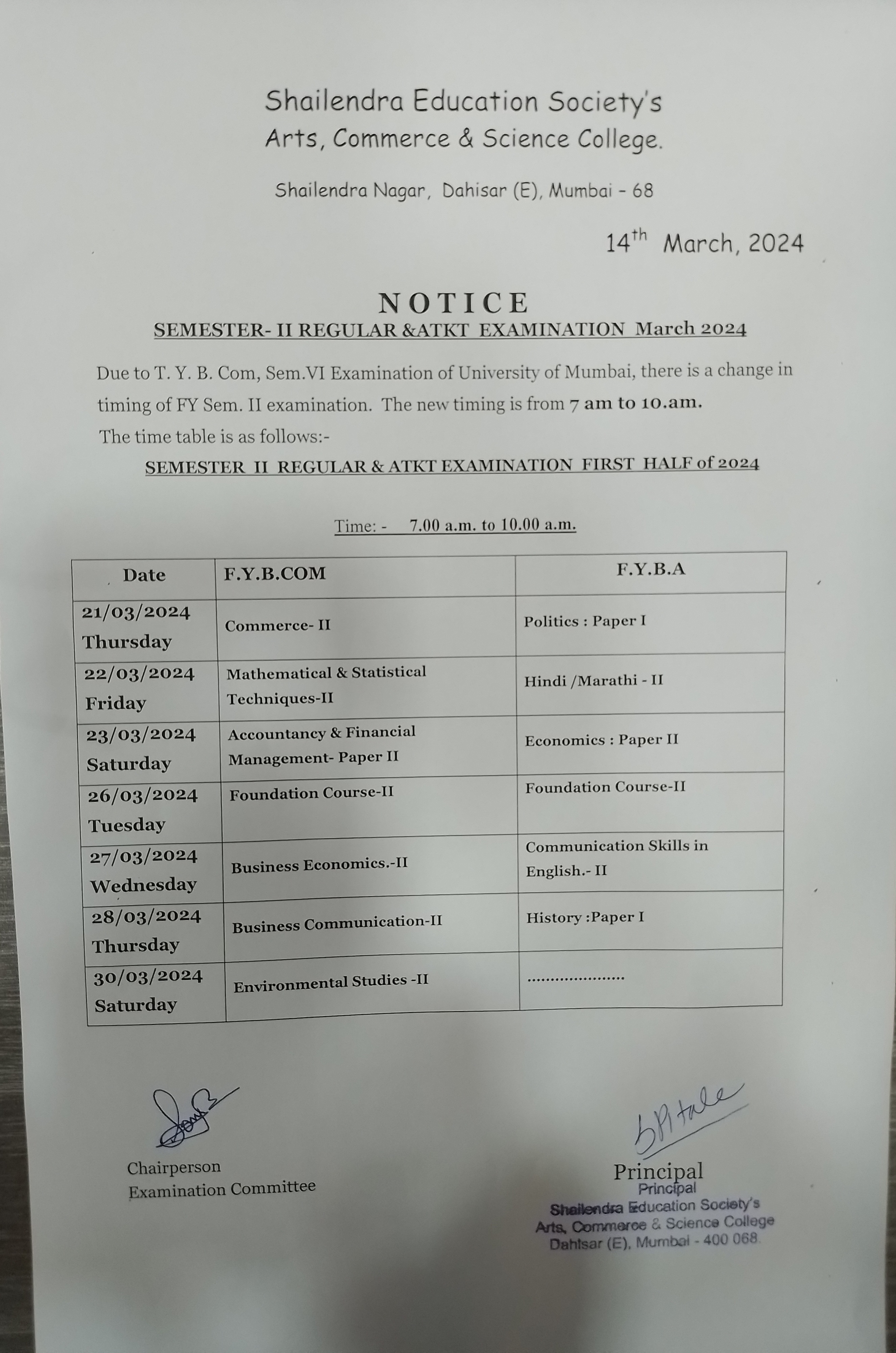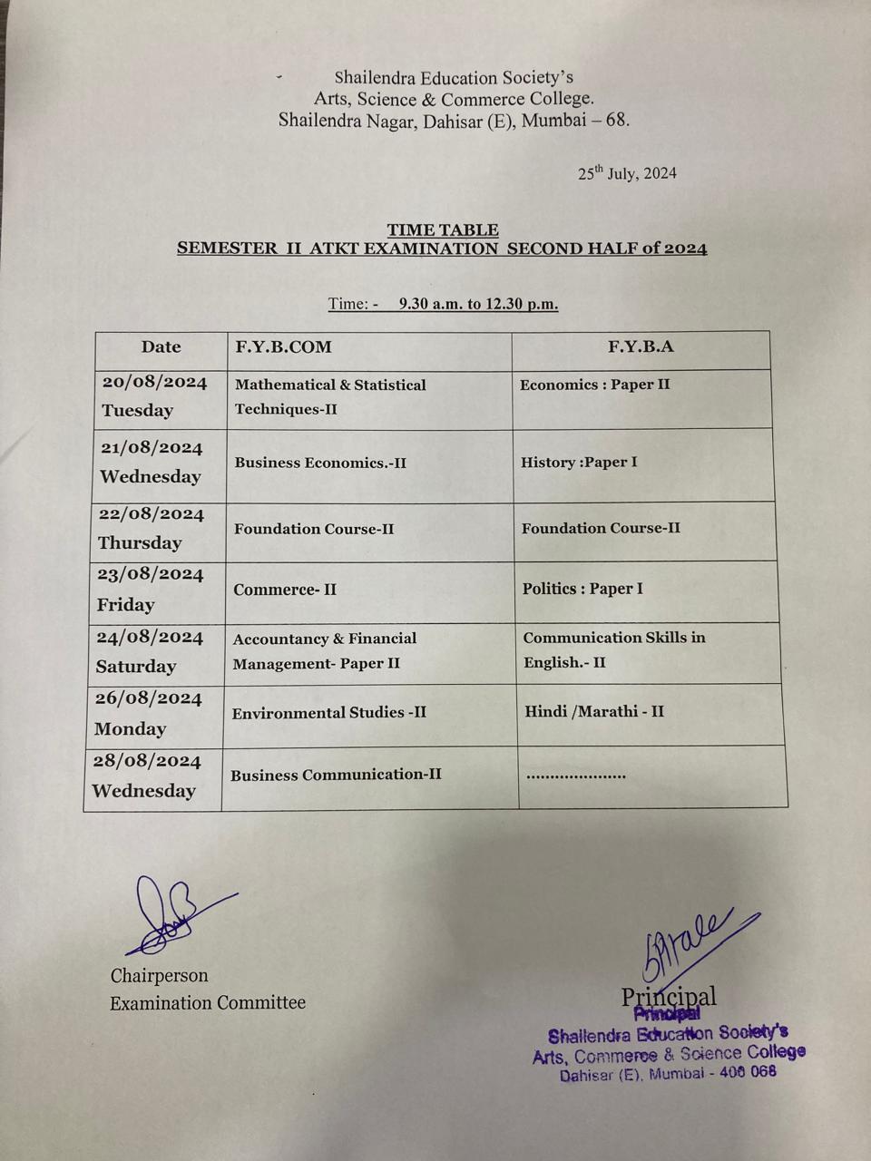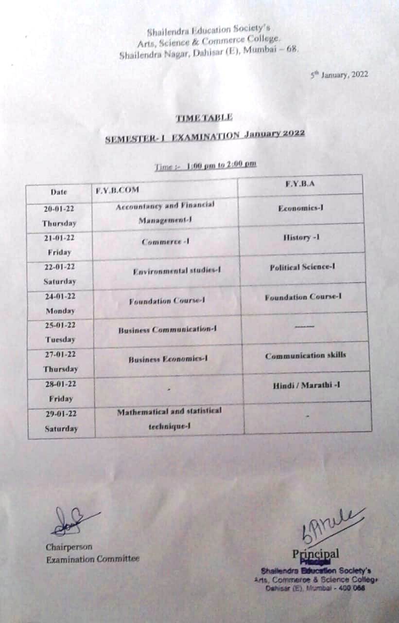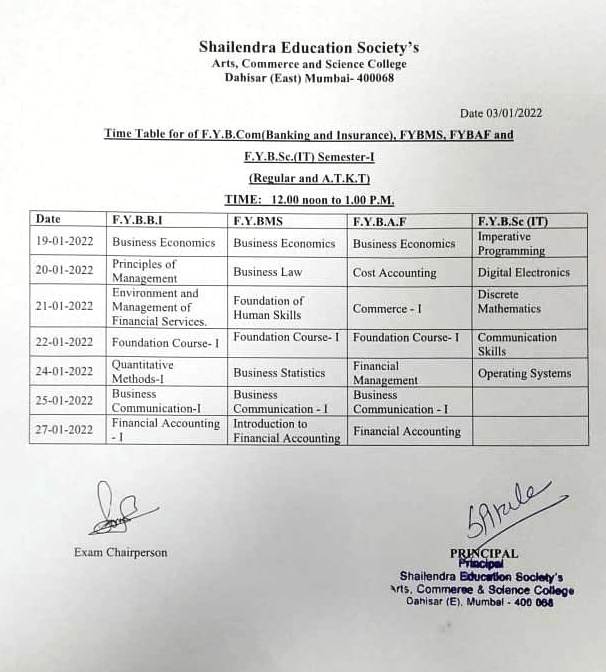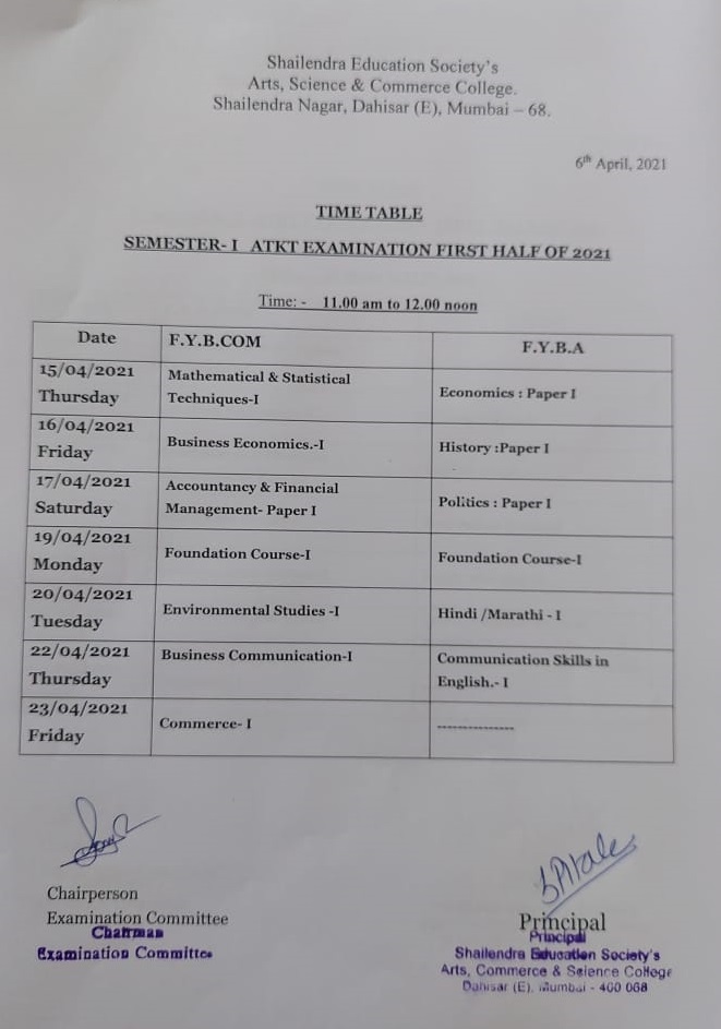 Time table of Additional Examination FYBA and FYBCOM