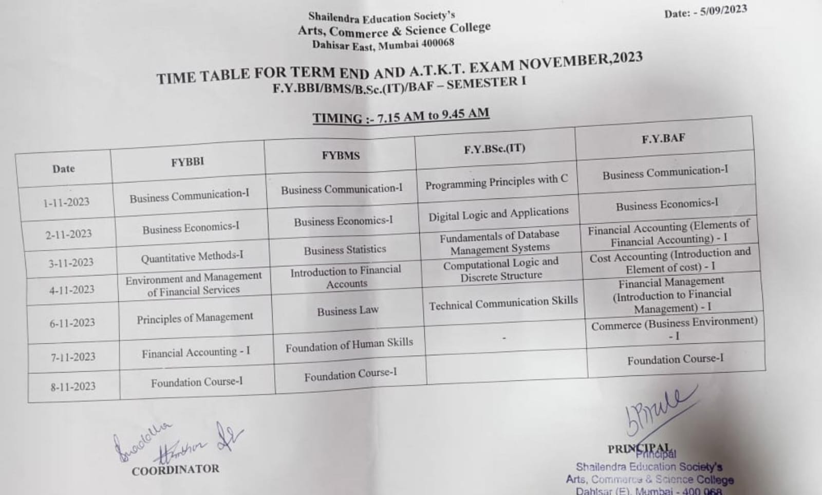 F.Y.BBI/BMS/BSc.IT SEM I Regular and ATKT Exam Timetable