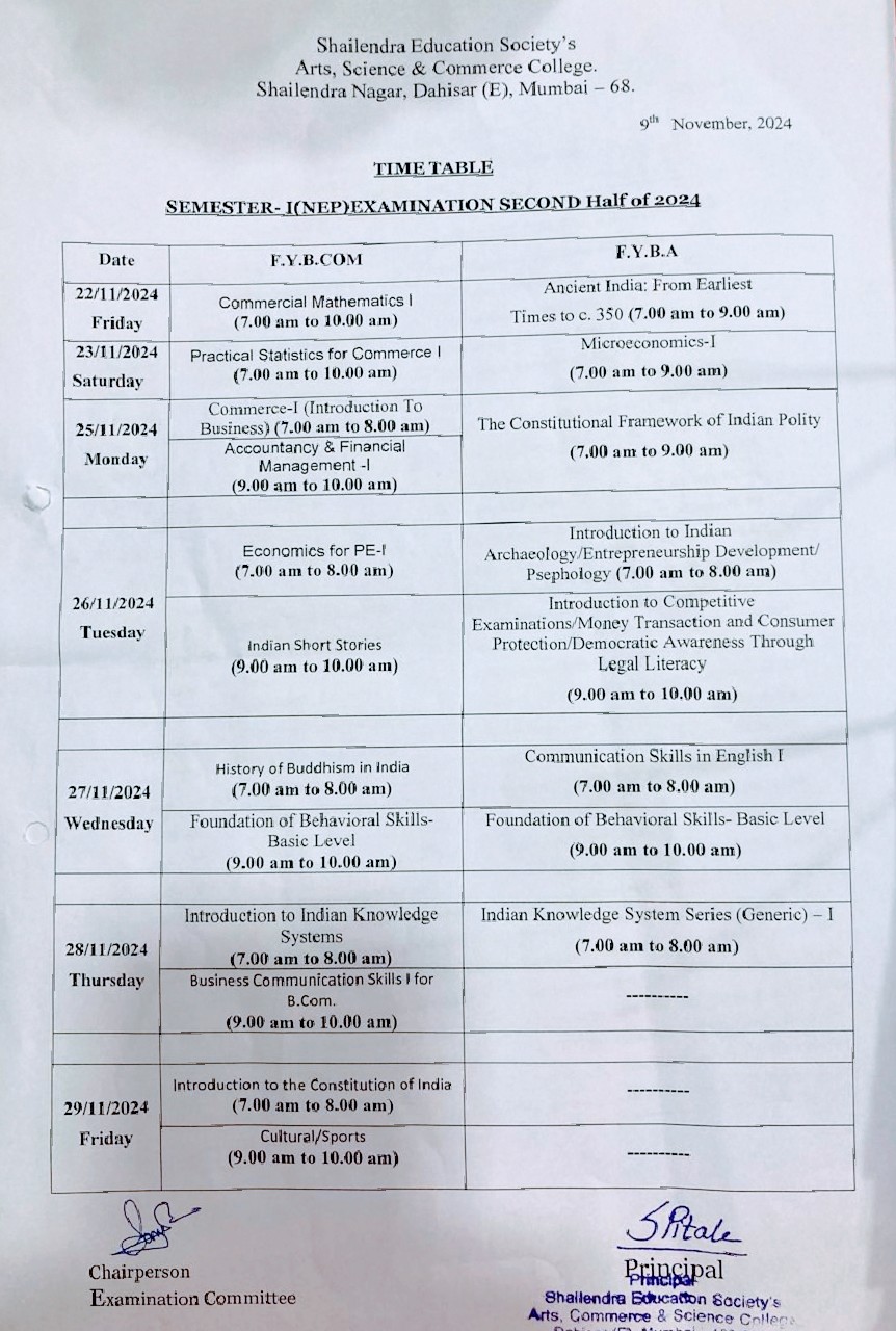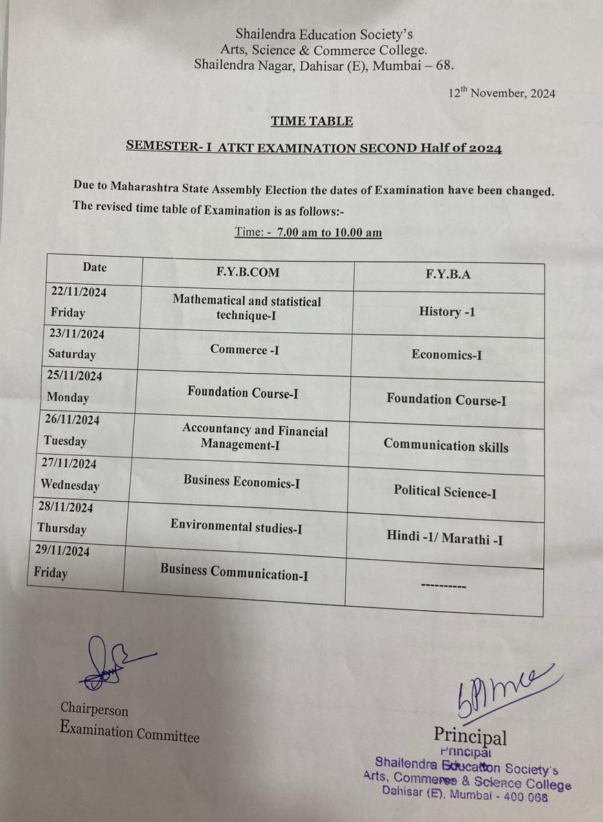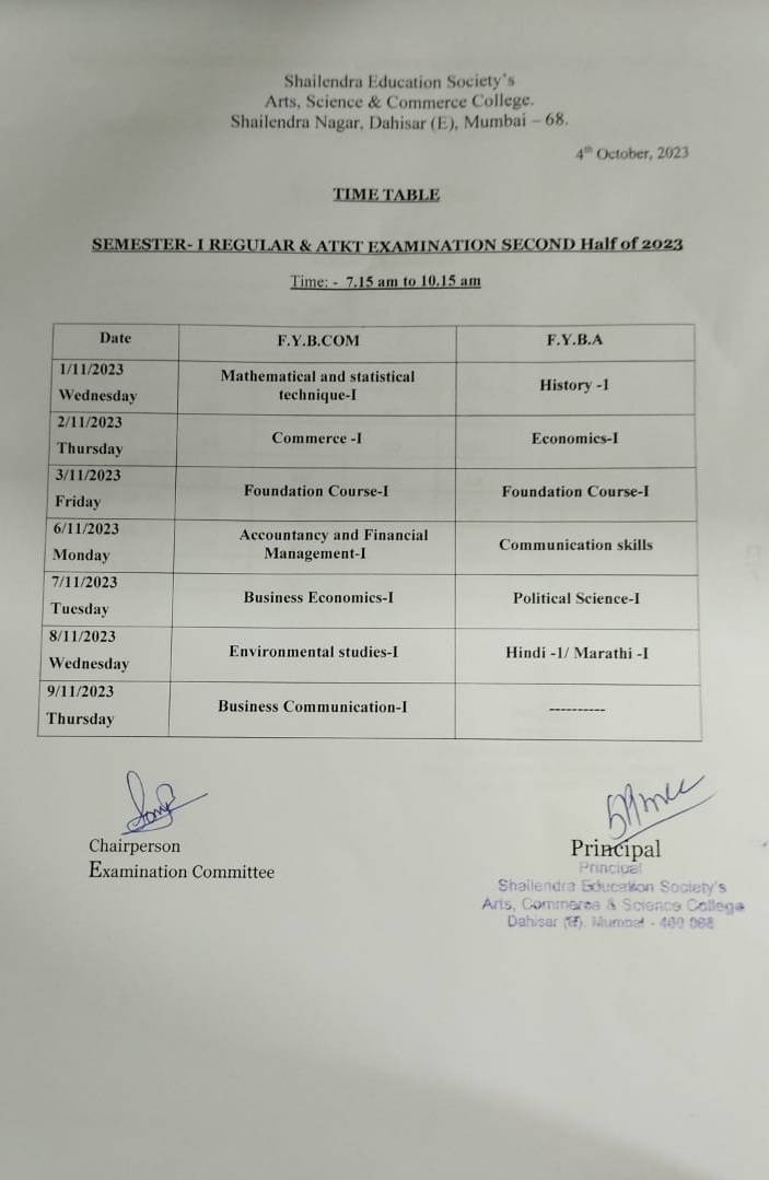 FYB.Com/B.A SEM I Regular and ATKT Exam time table