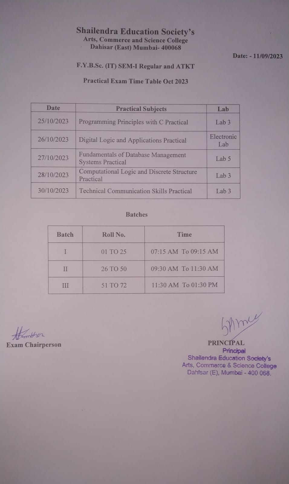 F.Y.BSc.IT SEM I ATKT Practical Exam Timetable
