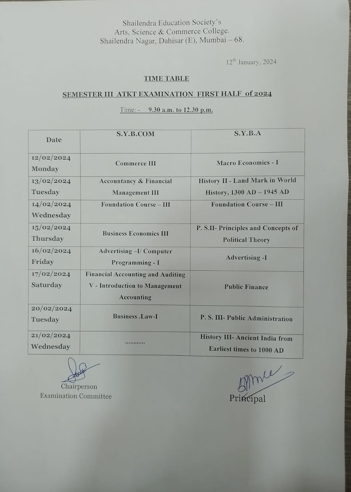 SYB.Com/B.A SEM III ATKT Exam time table