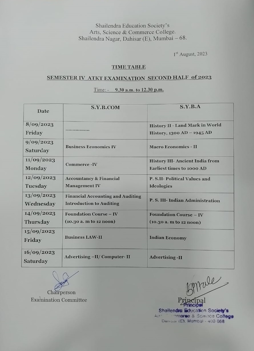 SY B.Com, BA SEM IV ATKT Second Half 2023 Examination Time Table