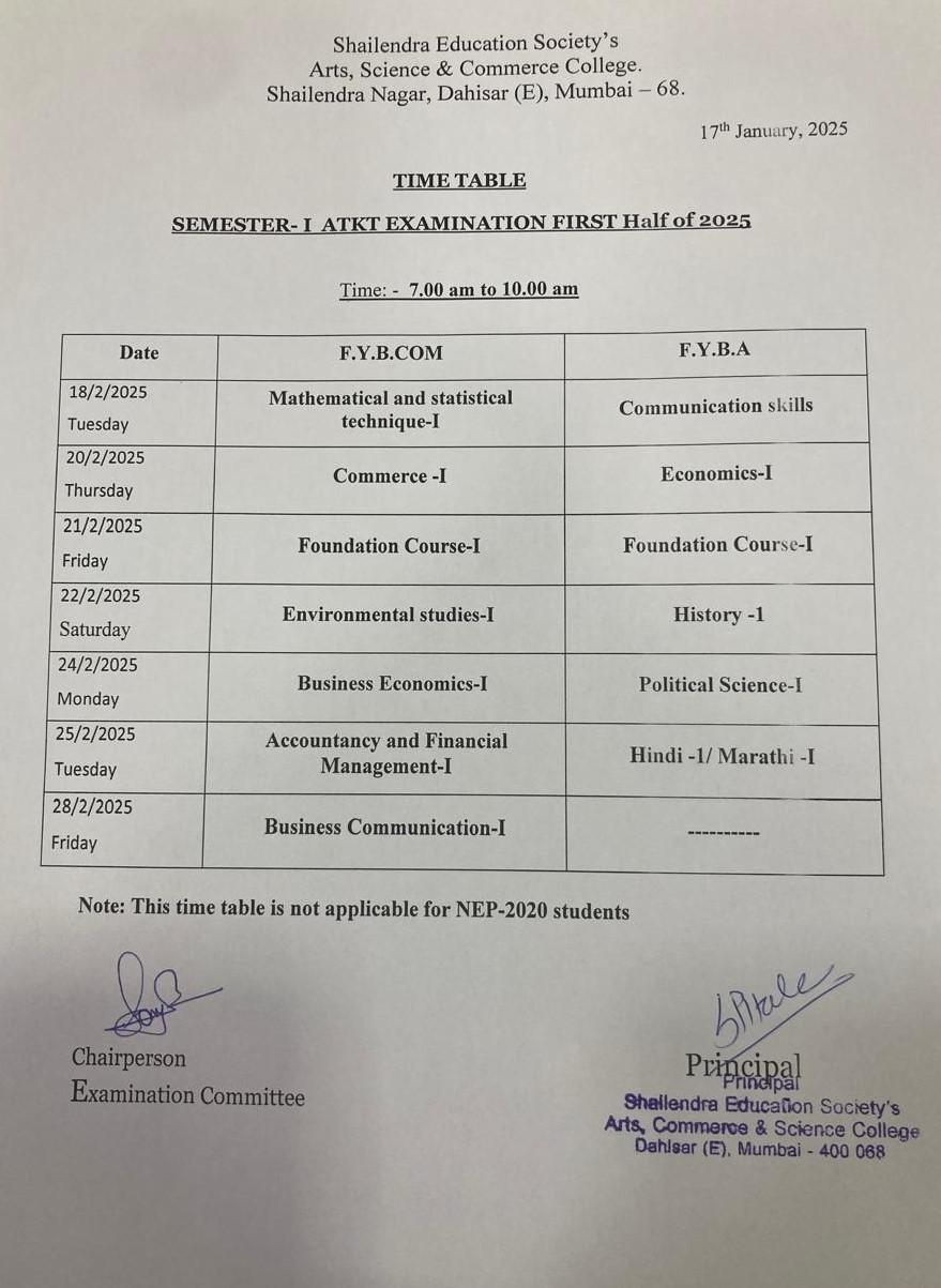 FYB.Com/B.A NEP 2020 SEM I ATKT Exam time table