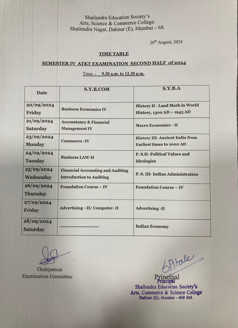 SYB.Com/B.A SEM IV and ATKT Exam time table