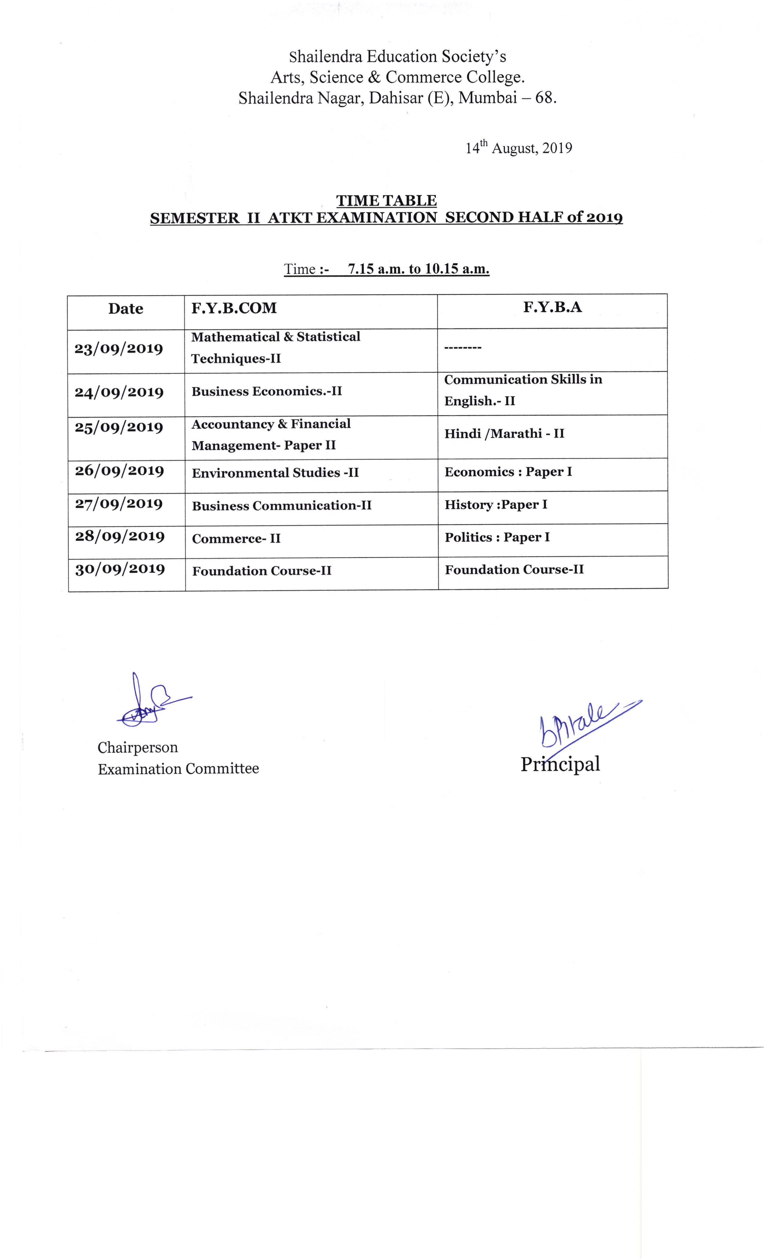 Time Table for Winter Exam September/October 2019