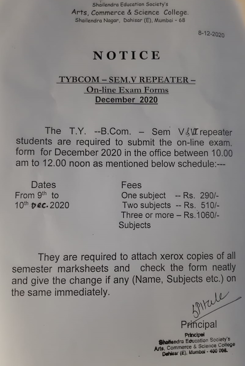 F.Y./S.Y./B.A/B.Com/BBI/BMS/BSCIT ATKT Exam Form Fill Notice