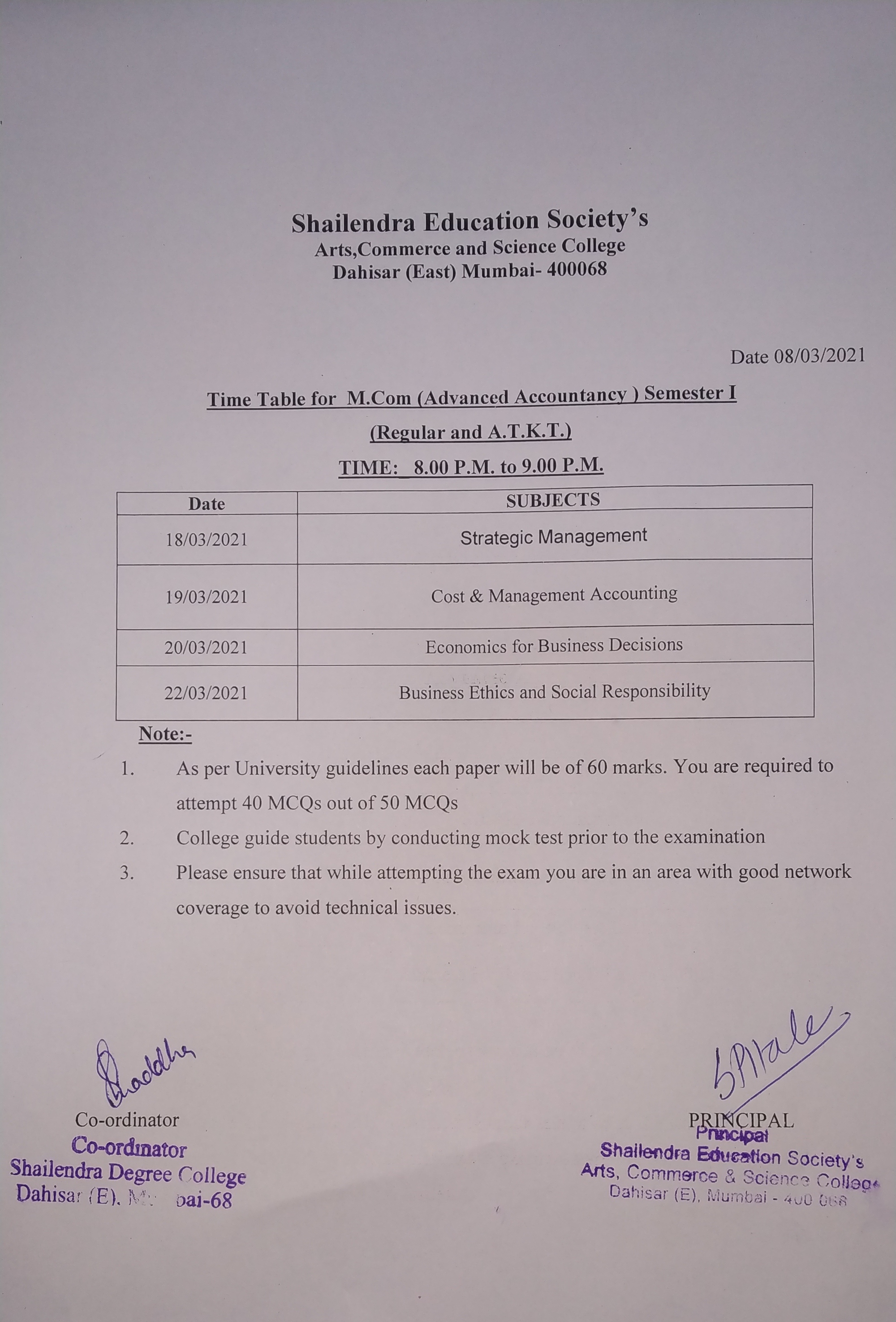 M.Com. Internal (sem I and Sem IV) Exam Timetable