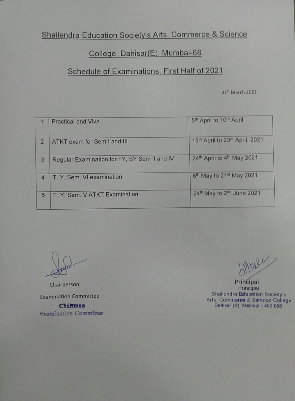 Schedule of Examination, First half of 2021