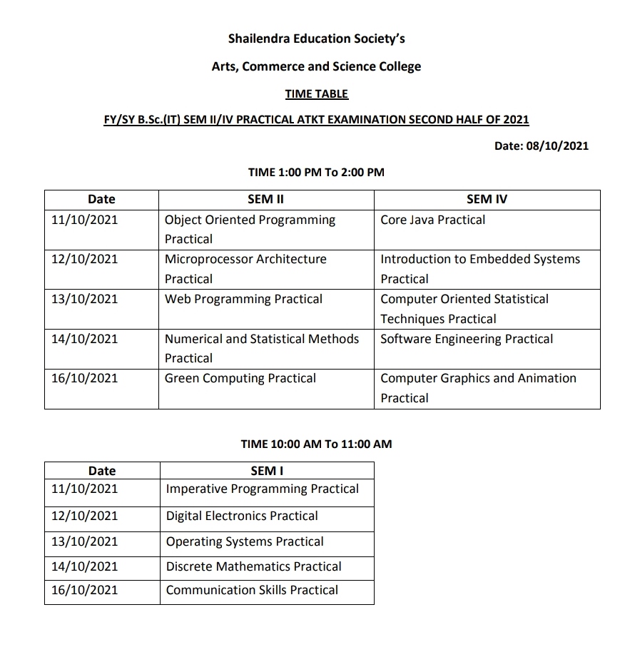 F.Y./S.Y.B.SC.(IT) SEM I/II/IV ATKT Practical Examination Second half of 2021 Time Table