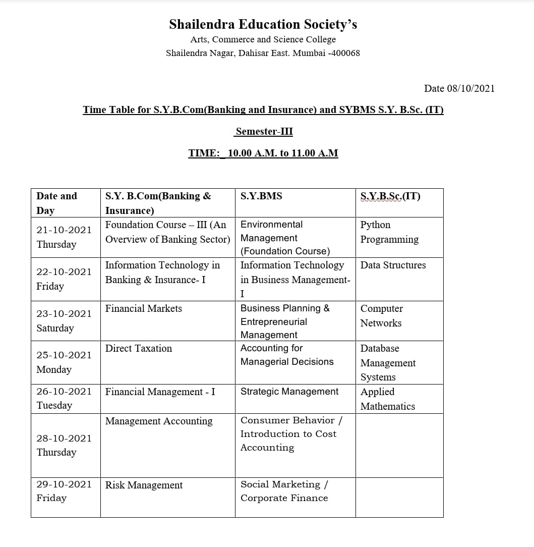 S.Y./T.Y.B.B.I./B.M.S./B.SC.(IT) SEM III/V Internal Examination Second half of 2021 Time Table