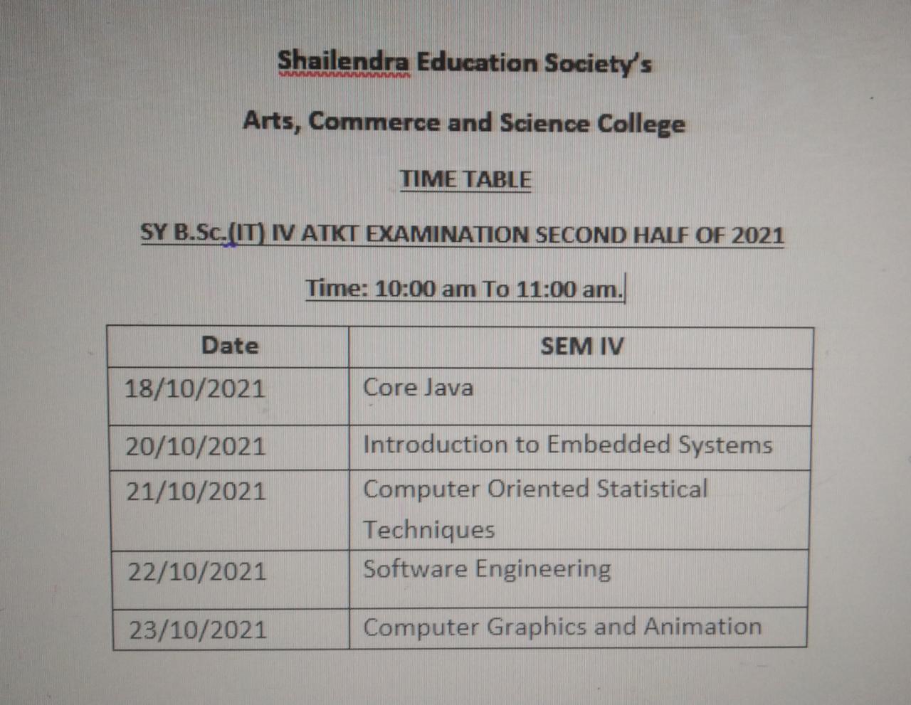 S.Y.B.SC.(IT) SEM IV ATKT Term End Examination Second half of 2021 Time Table