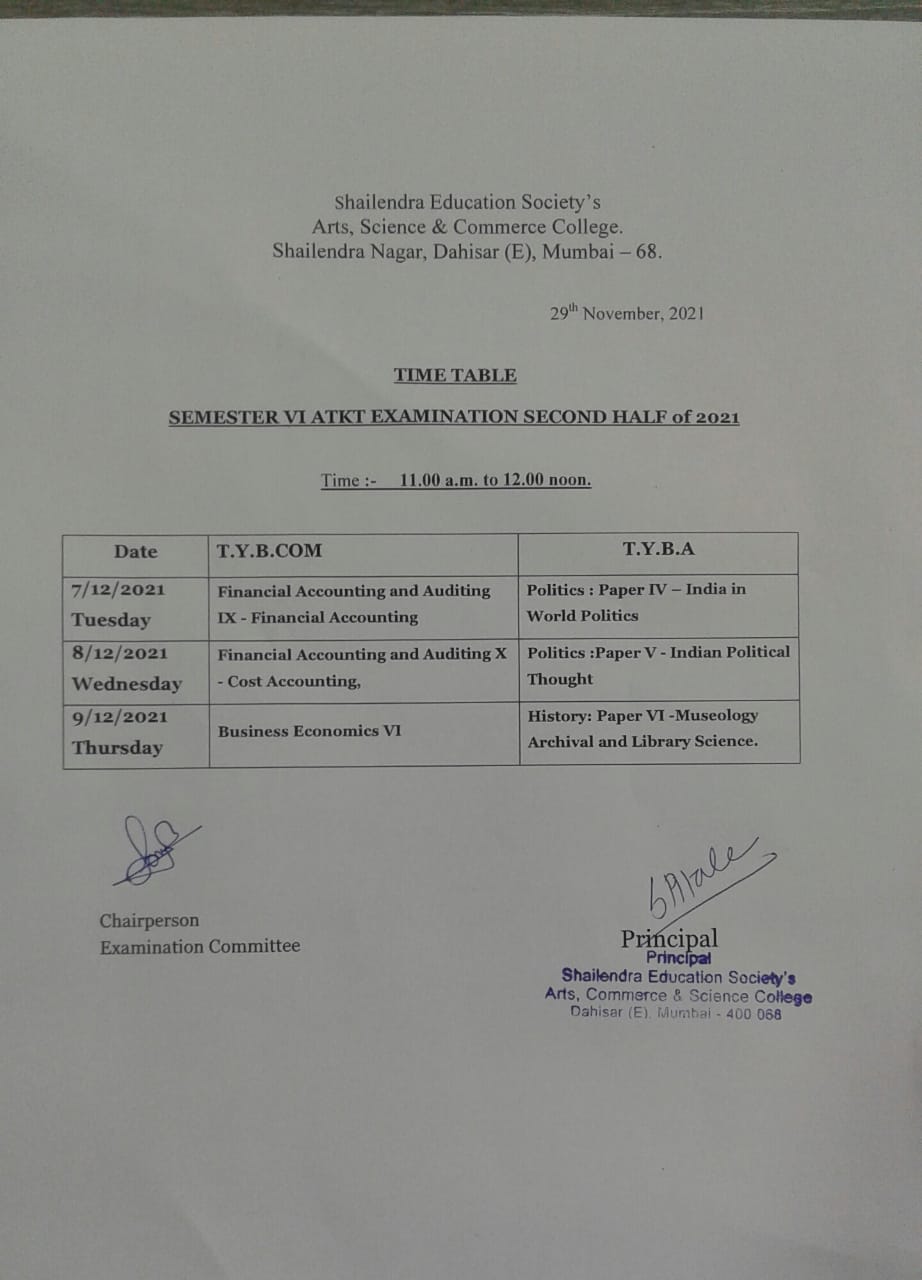 T.Y.B.A/B.Com SEM V ATKT and SEM VI(ATKT+Regular) Time Table